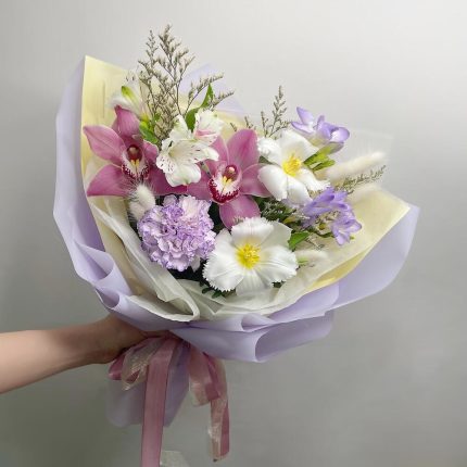 НЮ премиум мини-композиция из экзотической орхидеи и диантусов в шляпной коробке