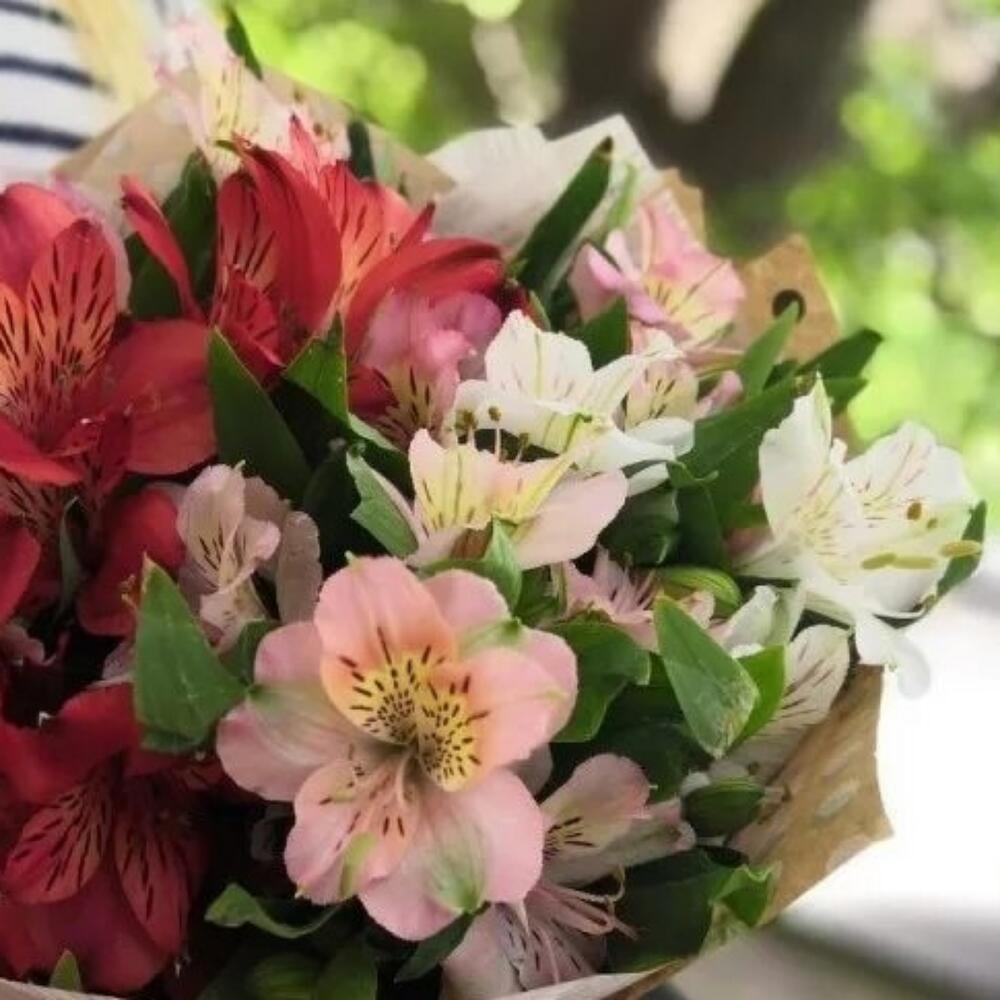 Альстромерия – 7 шт.Упаковка дизайнерская – 1 шт.Лента атласная – 2 шт.