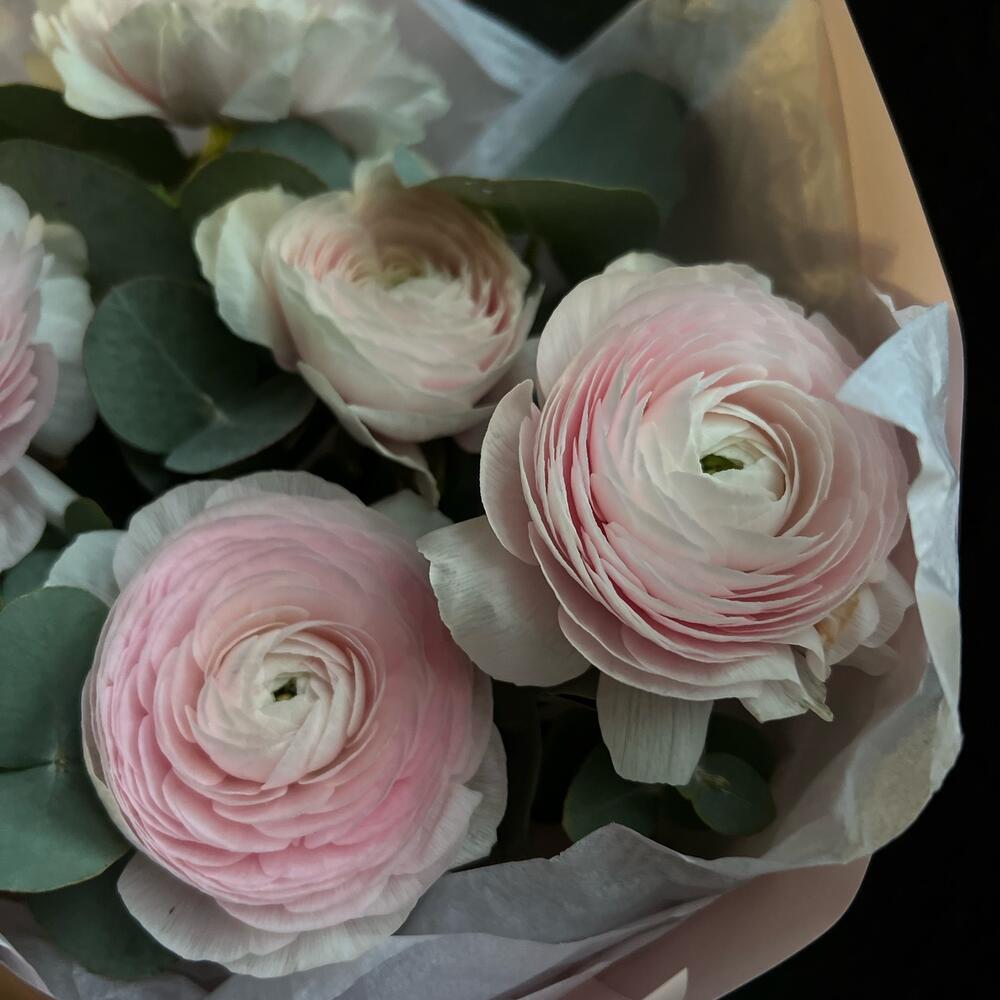 Ранункулюс – 5 шт.Эвкалипт – 5 шт.декоративная упаковка – 1 шт.Атласная лента – 1 шт.