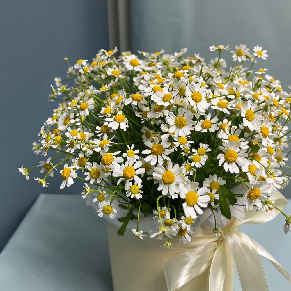 Матрикария – 11 шт.Тишью – 1 шт.Коробка шляпная – 1 шт.Лента атласная – 1 шт.Оазис флористический – 1 шт.
