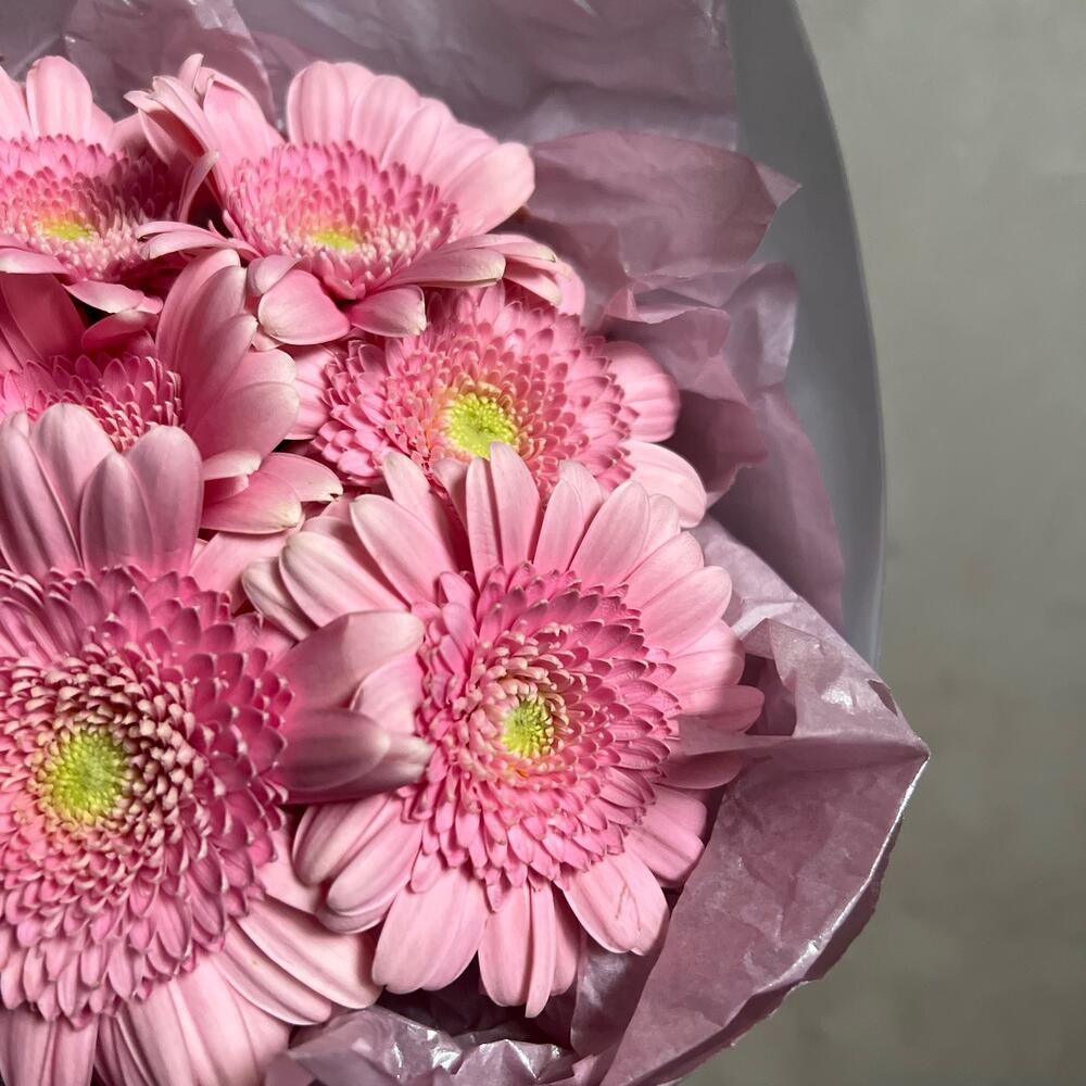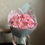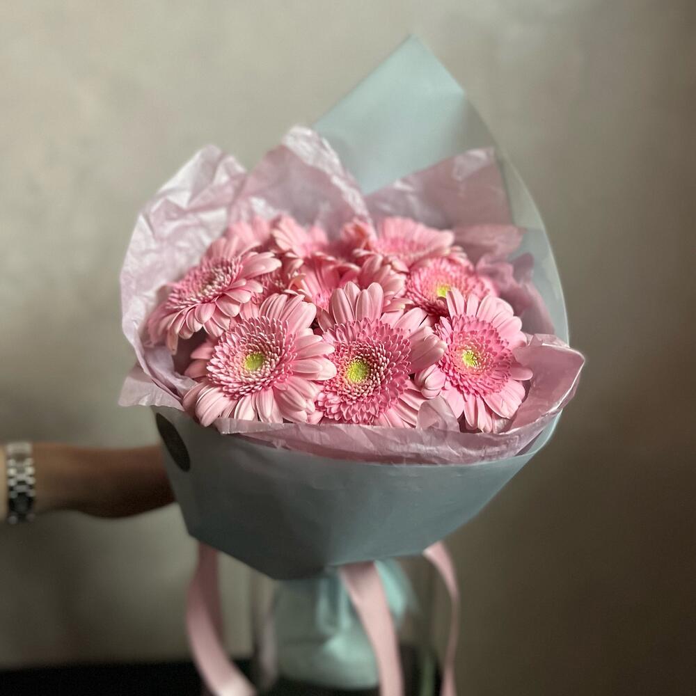 Гербера розовая – 9 шт.декоративная упаковка – 1 шт.Атласная лента – 1 шт.