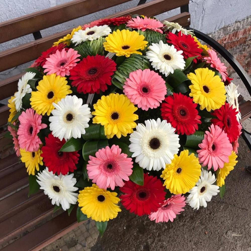 Аспидистра – 5 шт.Корзина – 1 шт.Зелень – 15 шт.Гербера – 61 шт.Фисташка – 15 шт.Берграсс пучок – 1 шт.Оазис флористический – 4 шт.
