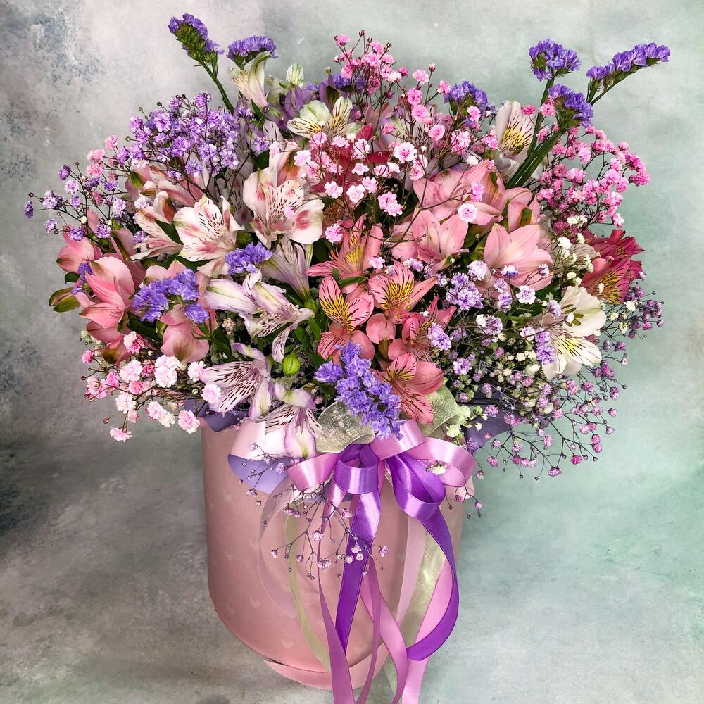 Альстромерия – 18 шт.гипсофила радужная – 6 шт.Статица – 2 шт.Коробка шляпная – 1 шт.Оазис флористический – 2 шт.ленты атласные – 4 шт.