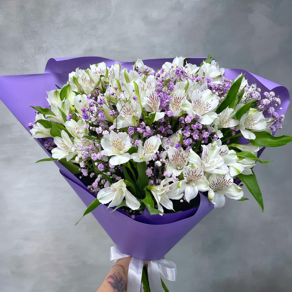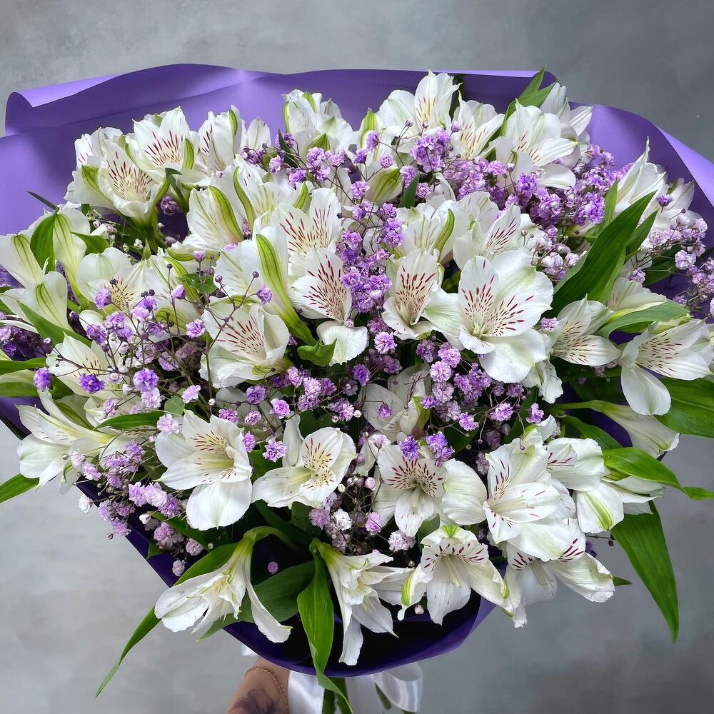 Стойкий букет в духе Прованса из нежной белой альстромерии с сиреневой гипсофилой в составе. Букетик на свидание, День рождения и просто без повода для хорошего настроения.