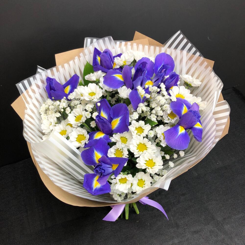 Сантини – 5 шт.Ирис – 7 шт.Гипсофила – 1 шт.Рускус – 5 шт.Крафт – 1 шт.