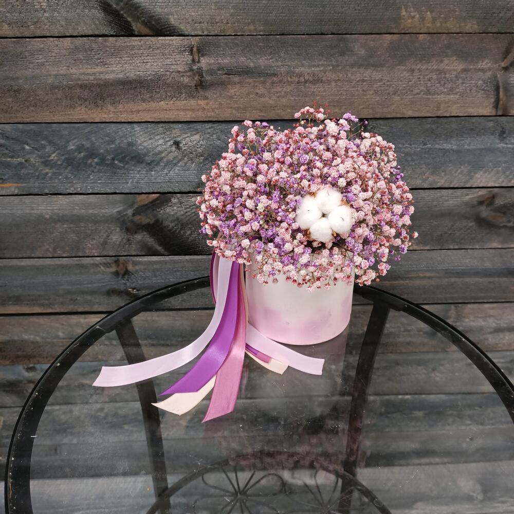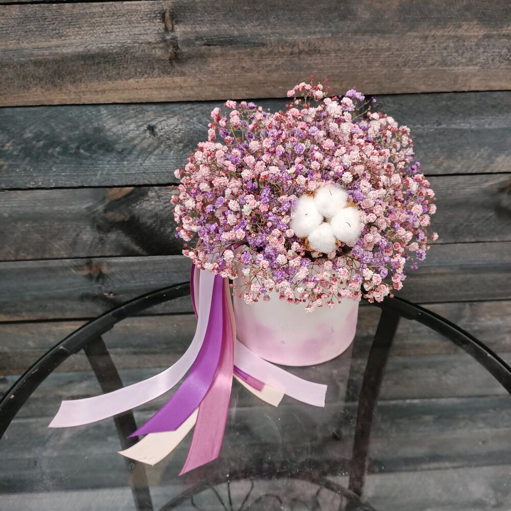 Гипсофила – 4 шт.Хлопок – 1 шт.Лента атласная – 1 шт.Шляпная коробка – 1 шт.Оазис флористический – 1 шт.
