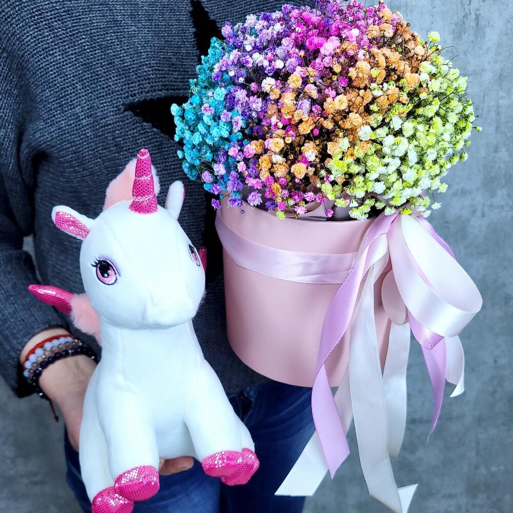 Единорог Лизонька со стаканчиком белоснежной гипсофилы