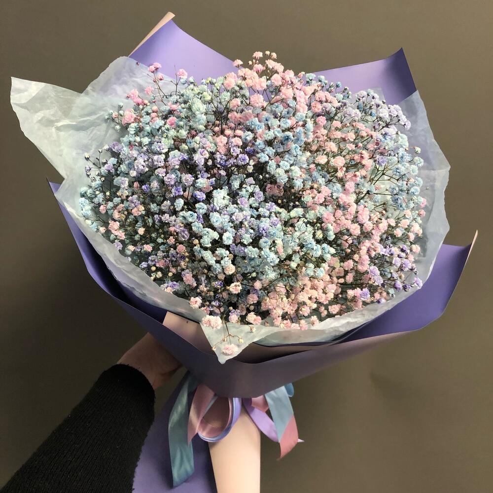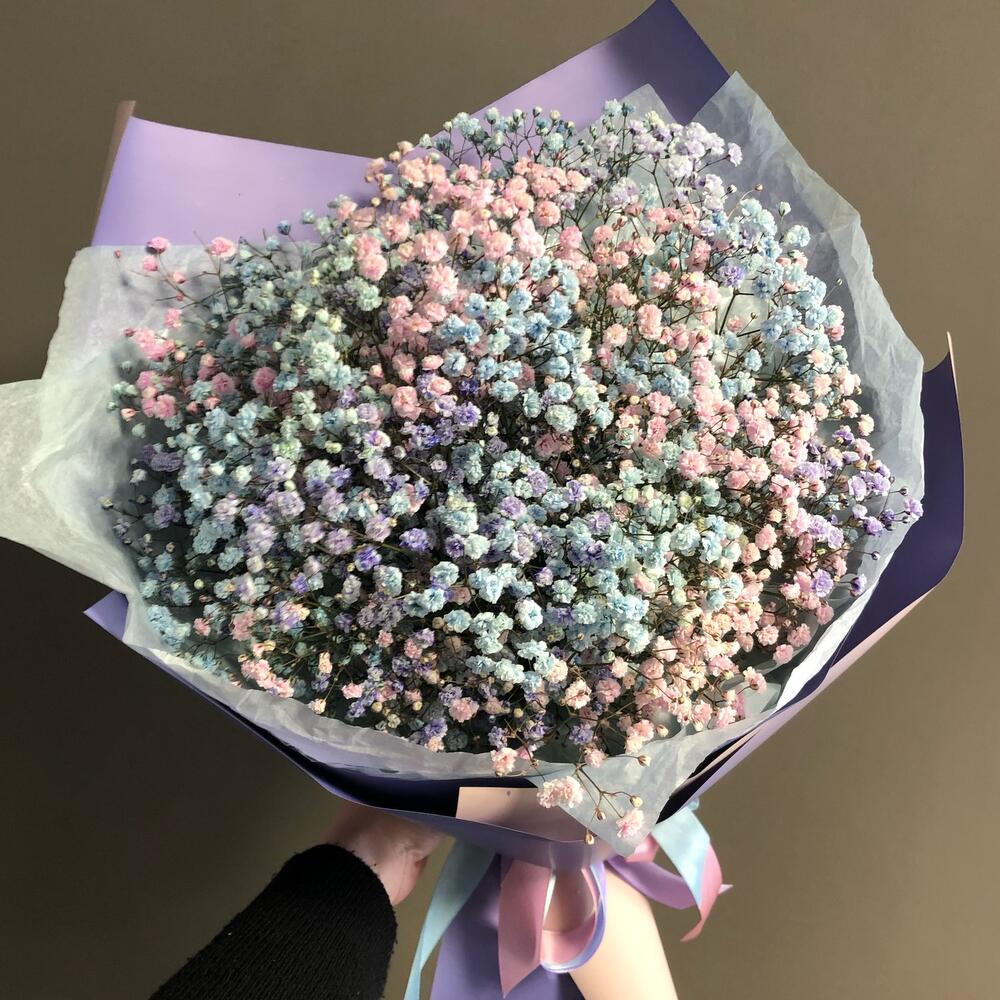 Лента атласная – 3 шт.Тишью – 2 шт.гипсофила цветная – 5 шт.пленка матовая градиент – 5 шт.