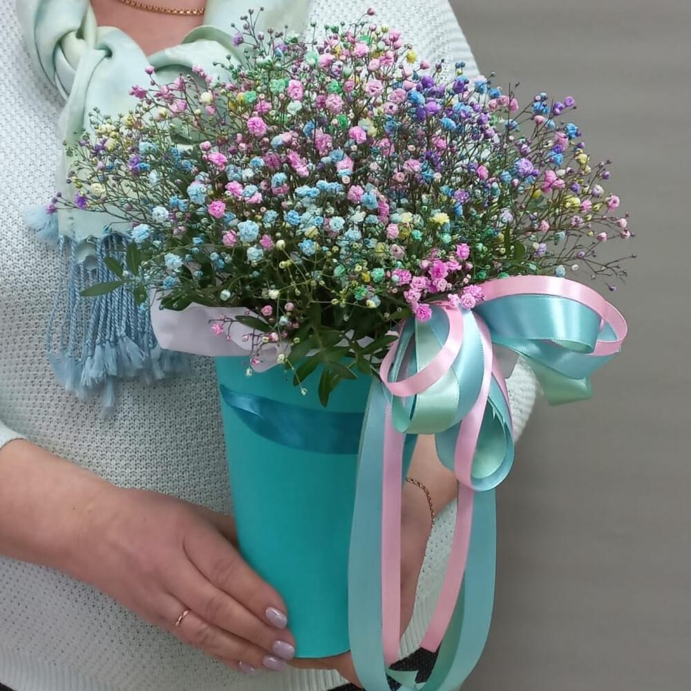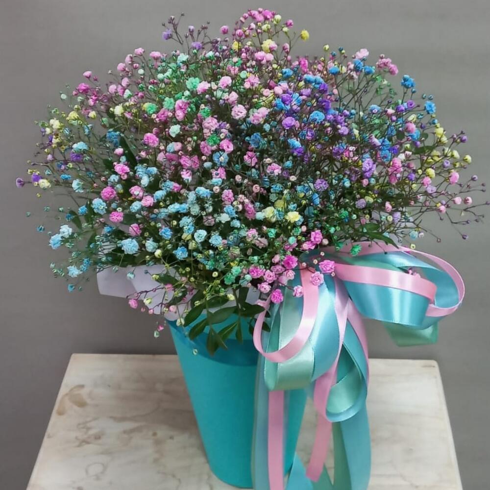 гипсофила радужная – 5 шт.Фисташка – 1 шт.Кашпо – 1 шт.Пленка матовая – 1 шт.Оазис флористический – 1 шт.