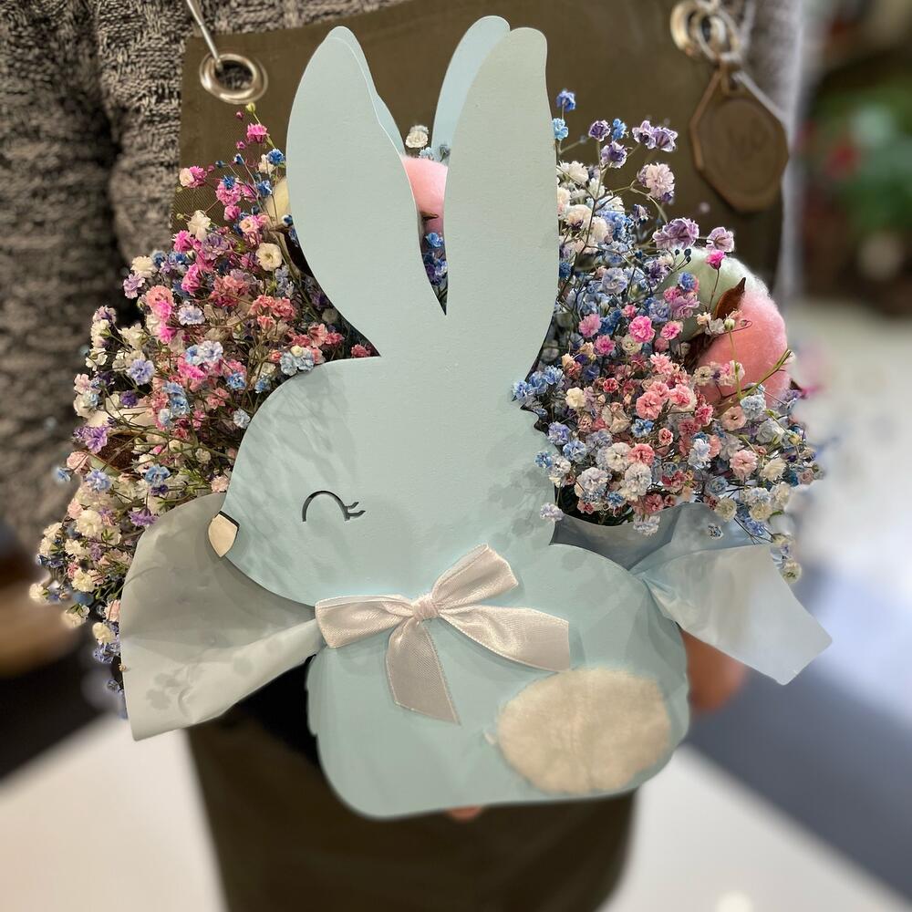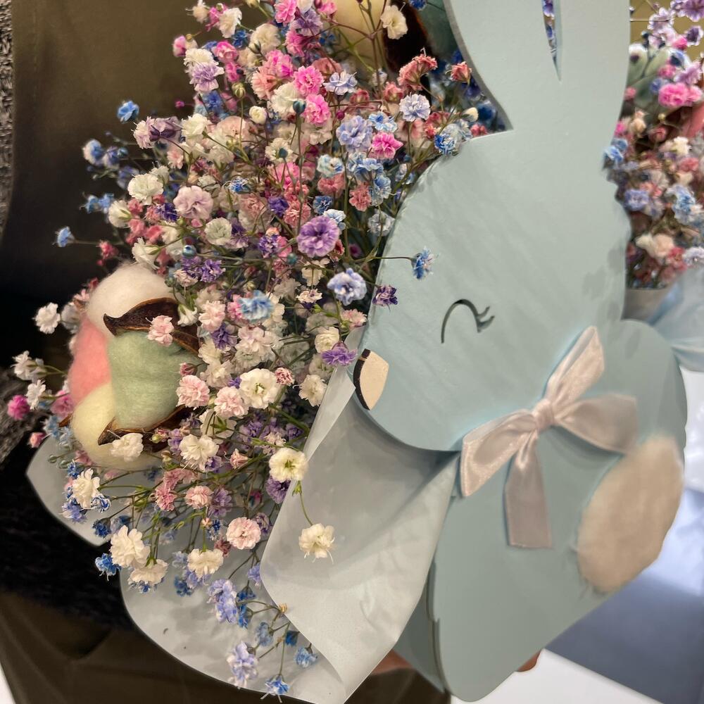 Гипсофила – 5 шт.Пленка матовая – 1 шт.Губка флористическая – 1 шт.хлопок цветной – 3 шт.ящик для цветов кролик – 1 шт.