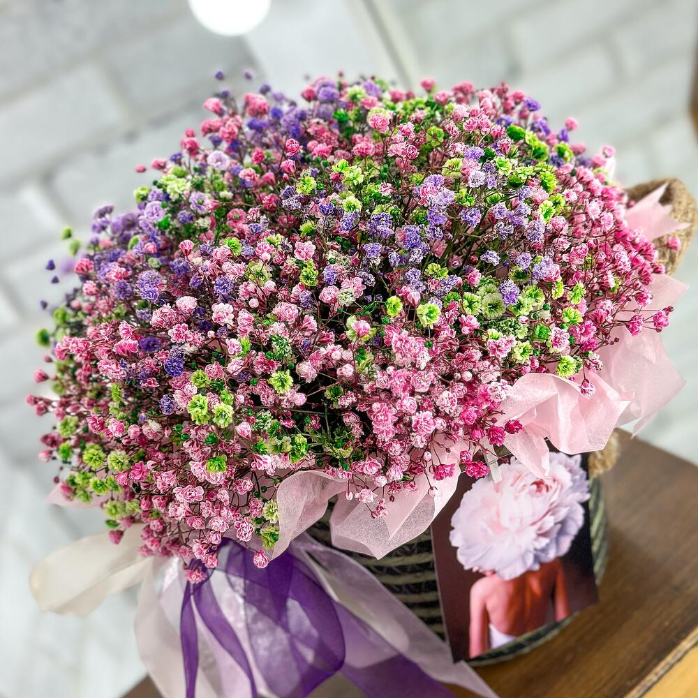 Тишью – 2 шт.Кашпо плетеное – 1 шт.Открыточка с вашими пожеланиями – 1 шт.Оазис флористический – 1 шт.подкормка для срезанных цветов – 1 шт.инструкция по уходу за цветами – 1 шт.гипсофила радужная – 9 шт.