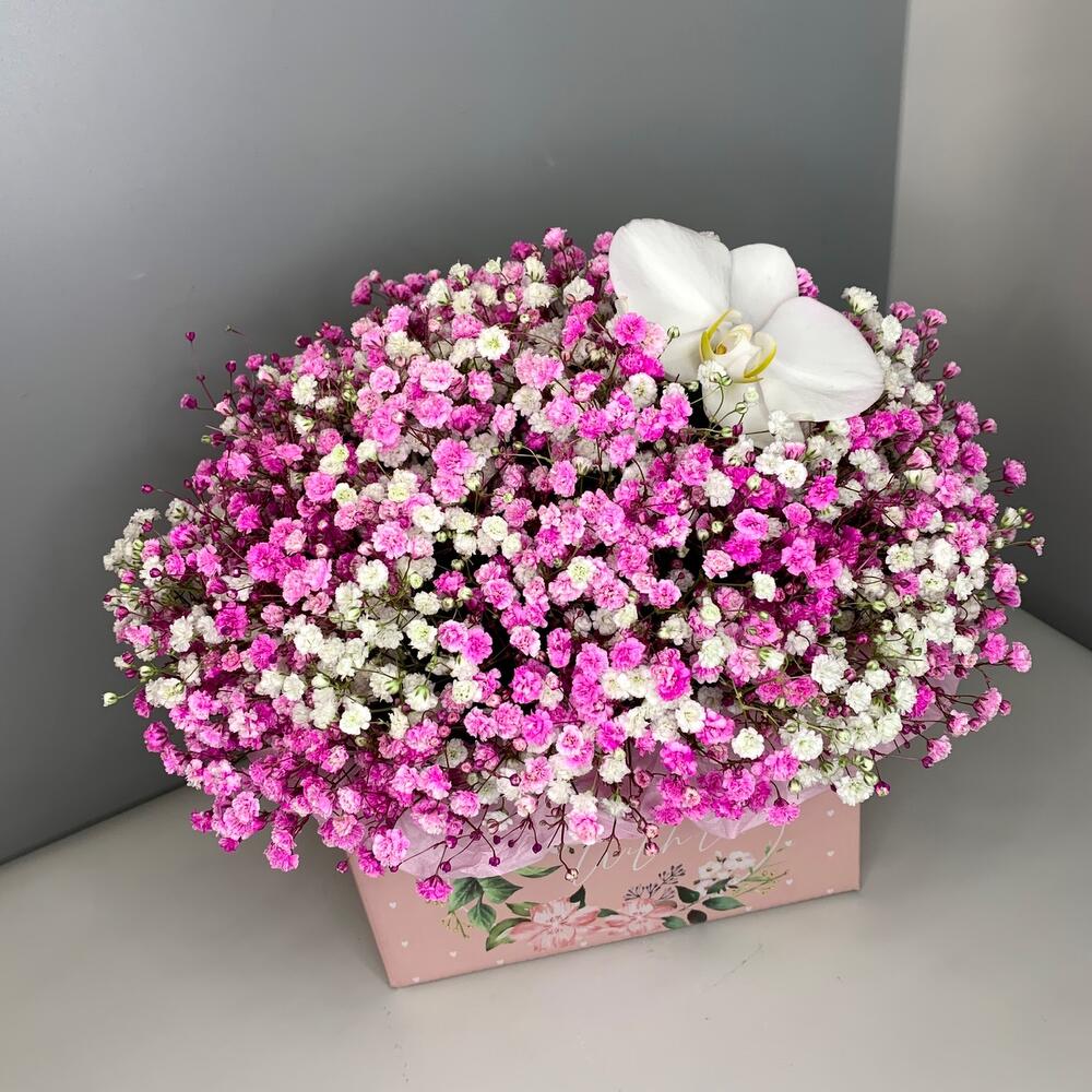 гипсофила радужная – 6 шт.орхидея фаленопсис цветок – 1 шт.Коробка – 1 шт.Тишью – 2 шт.Оазис флористический – 1 шт.Пленка прозрачная – 1 шт.Лента атласная – 2 шт.