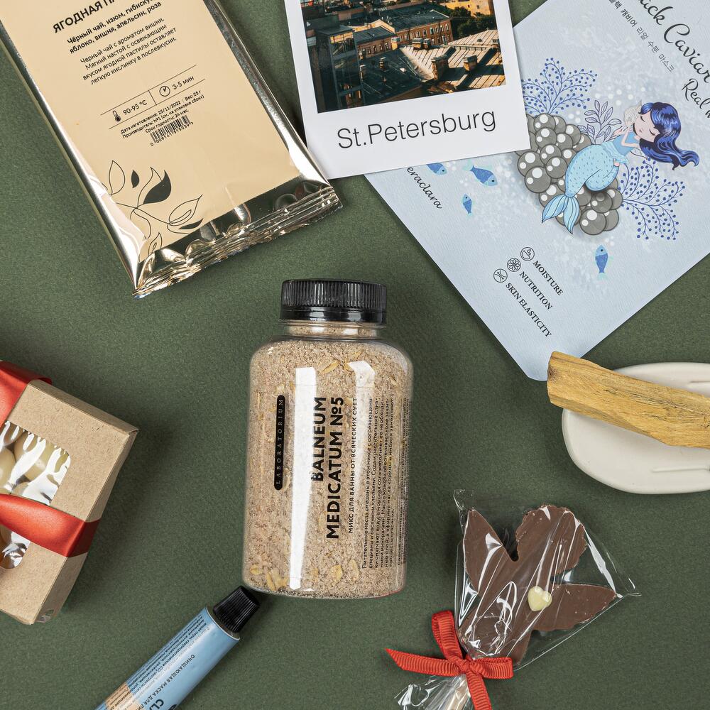 соль для ванной laboratorium – 1 шт.маска глиняная для лица laboratorium – 1 шт.ангел “счастье” – 1 шт.коробочка орехов в шоколаде – 1 шт.благовоние пало санто – 1 шт.подставка-ладошка для благовоний из гипсофила – 1 шт.чай кантата – 1 шт.тканевая для лица – 1 шт.