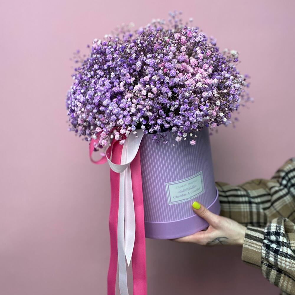 “Сиреневый туман” – композиция из гипсофилы в шляпной коробке