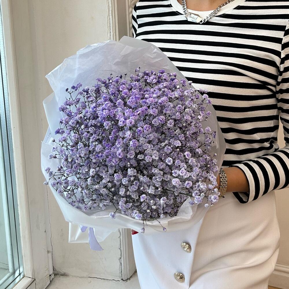 Букет из сиреневых гипсофил в дизайнерской упаковке.Гипсофилы отличаются отличной стойкостью и со временем превращаются в сухоцвет.Что входит в наш сервис:- транспортировочная упаковка к каждому заказк- кризал в подарок- подпишем открытку с вашим поздравлением- … Показать ещёподберем шарики к букету по запросу (за дополнительную плату)