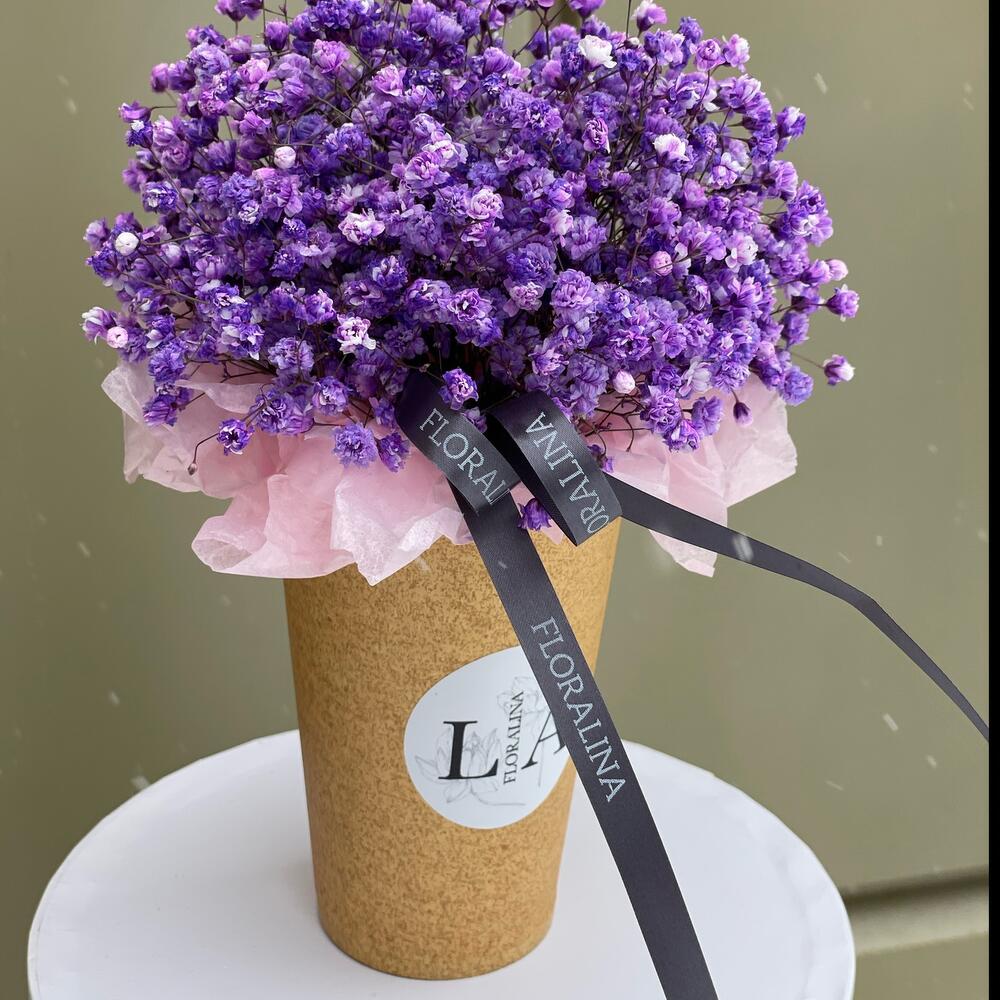 Стаканчик с гипсофилой – отличный вариант небольшого презента к основному подарку или просто так,без повода)Композиция имеет небольшой размер,ее удобно доставить домой или на работу Также она со временем превращается в сухоцвет и будет долго радовать своей красотой и … Показать ещёукрашать дом или рабочее место