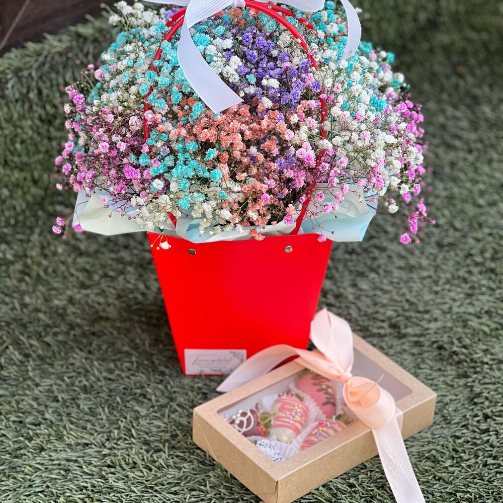 Яркая радужная композиция с гипсофилой совместно с вкуснейшей клубникой в бельгийском шоколаде станут отличным дуэтом в качестве подарка для ваших близких