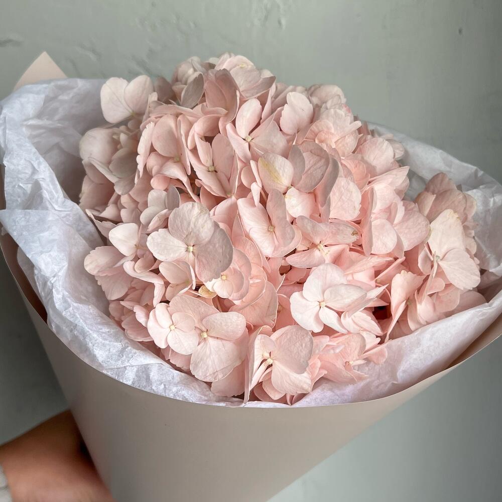 Лента атласная – 1 шт.Упаковка дизайнерская – 2 шт.Розовая гортензия – 1 шт.