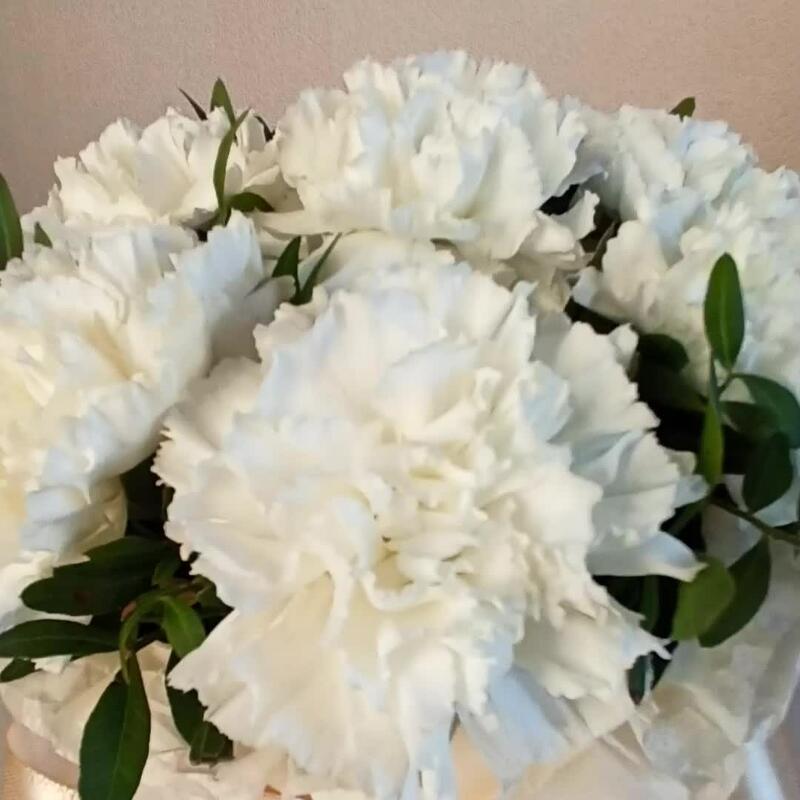 Гвоздика – 7 шт.Лента атласная – 2 шт.Тишью – 1 шт.Коробка шляпная – 1 шт.Оазис флористический – 1 шт.зелень декоративная – 3 шт.