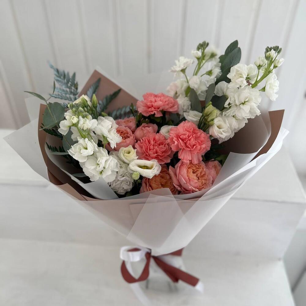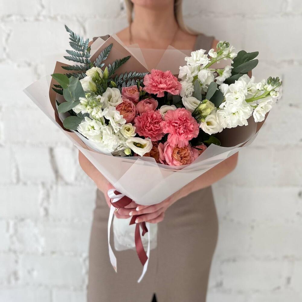 Маттиола – 3 шт.Папоротник – 1 шт.Эвкалипт – 2 шт.Диантус – 3 шт.Фисташка – 5 шт.Упаковка дизайнерская – 3 шт.эустома белая – 2 шт.пионовидные кустовые розы – 2 шт.