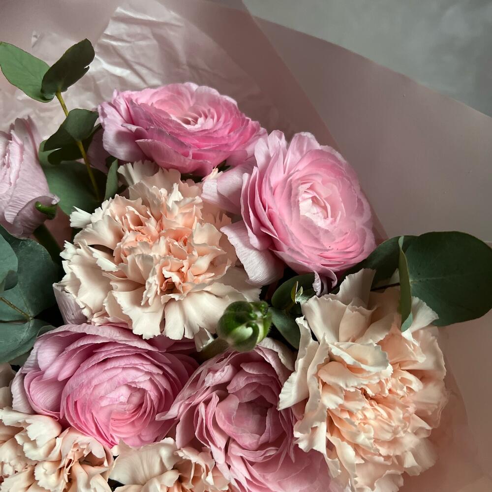 Ранункулюс – 5 шт.диантусы – 5 шт.Эвкалипт – 2 шт.декоративная упаковка – 1 шт.Атласная лента – 1 шт.