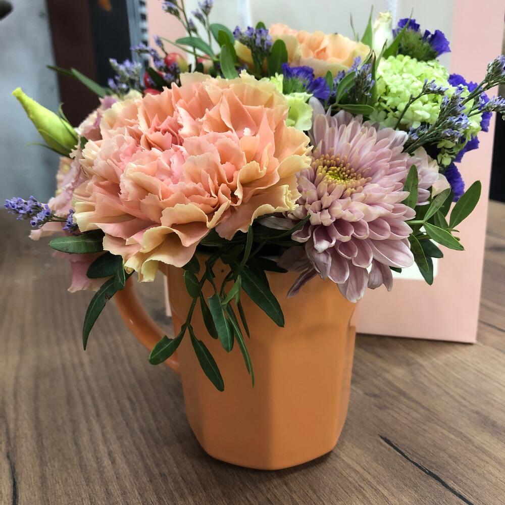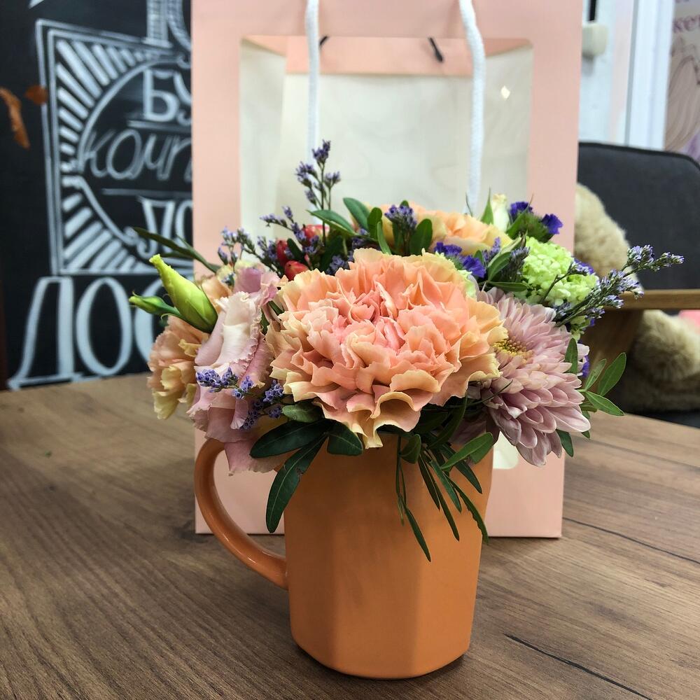 Диантус – 3 шт.Кустовая хризантема – 1 шт.Лимониум – 1 шт.Статица синяя – 1 шт.Гиперикум – 2 шт.Лизиантус – 1 шт.кружка керамика – 1 шт.Оазис флористический – 1 шт.пакет с окном – 1 шт.