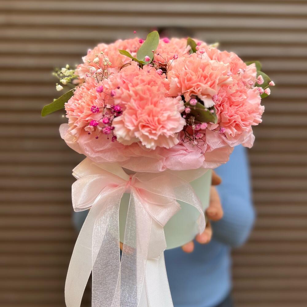 Эвкалипт – 5 шт.Оазис флористический – 1 шт.Диантус сортовой – 13 шт.Гипсофила розовая – 1 шт.коробка шляпная s – 1 шт.