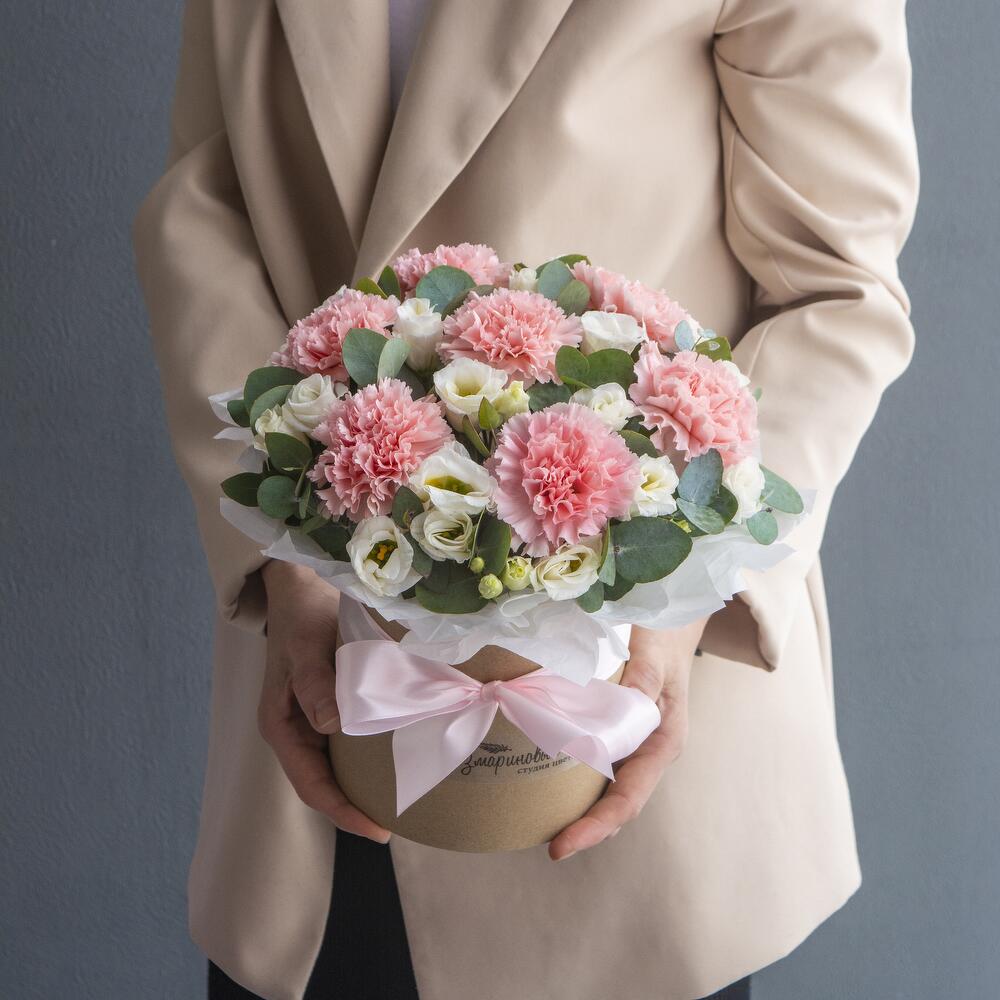 Коробочка розовых гвоздик с эустомой и эвкалиптом