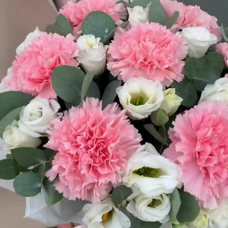 Эвкалипт – 8 шт.Гвоздика розовая – 7 шт.Коробка шляпная – 1 шт.Оазис кирпич – 1 шт.эустома белая – 2 шт.
