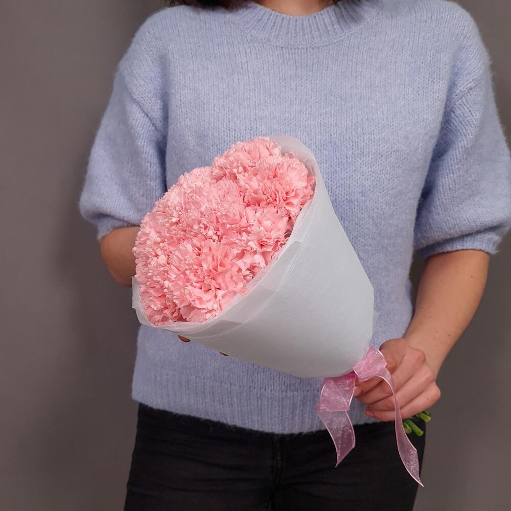 Гвоздика розовая – 11 шт.Упаковка – 1 шт.Аквапак – 1 шт.питательная смесь для срезанных цветов – 2 шт.