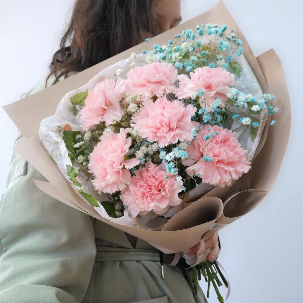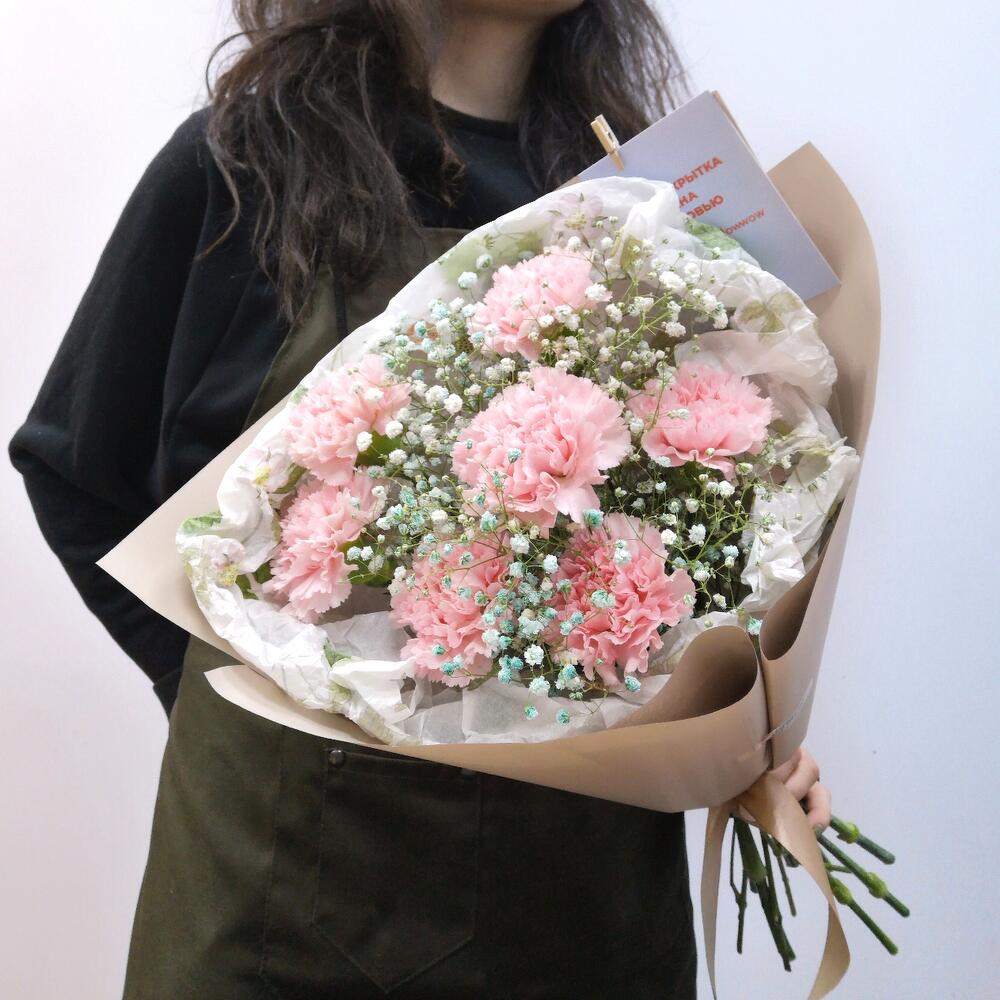 Диантус – 7 шт.гипсофила радужная – 2 шт.Упаковка – 1 шт.Лента атласная – 1 шт.