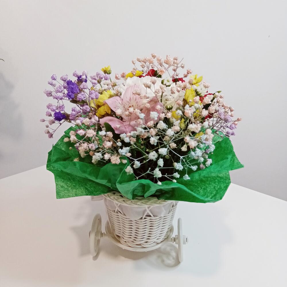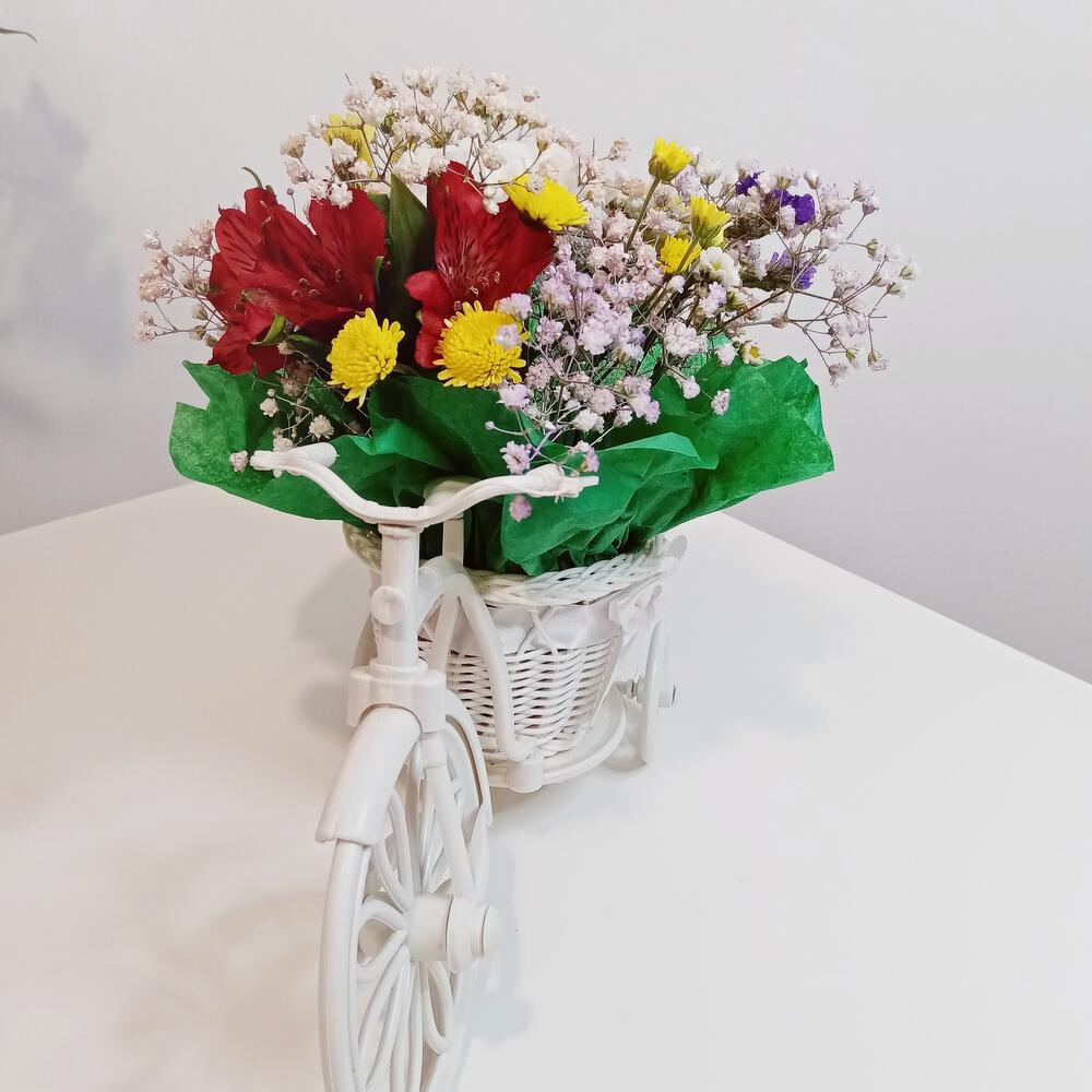Диантус – 1 шт.альстромерия микс – 2 шт.гипсофила микс – 1 шт.Хризантема кустовая Сантини – 1 шт.Статица – 1 шт.Флористический оазис – 1 шт.Велосипед – 1 шт.