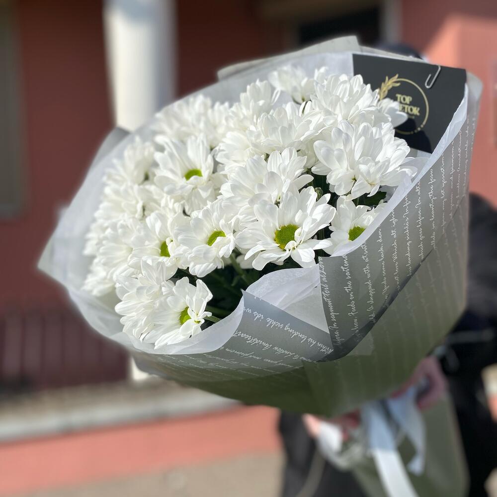 Букет из 5 веток ромашковых хризантем с дизайнерским оформлением . Количество ромашек в букете может достигать 51 штуки