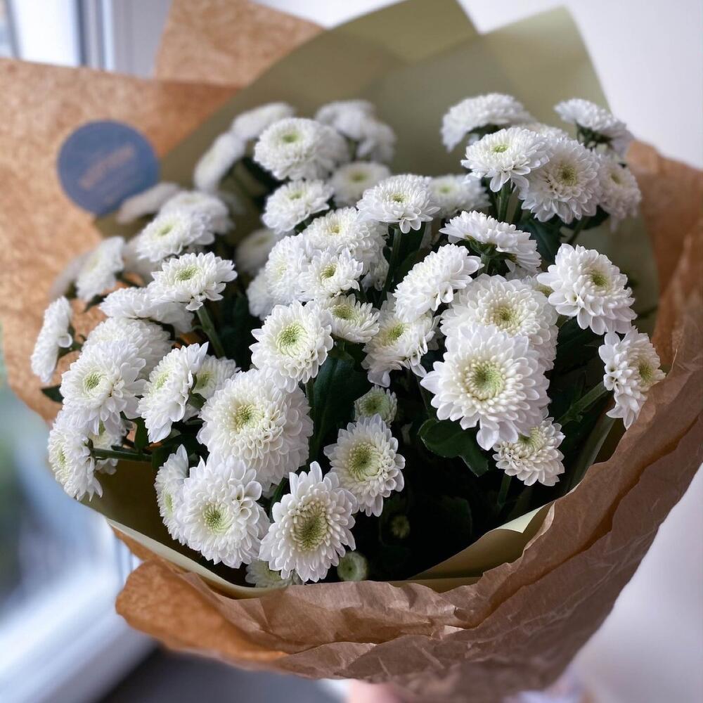 Хризантема сантини белая – 7 шт.Упаковка дизайнерская – 2 шт.Лента атласная – 1 шт.