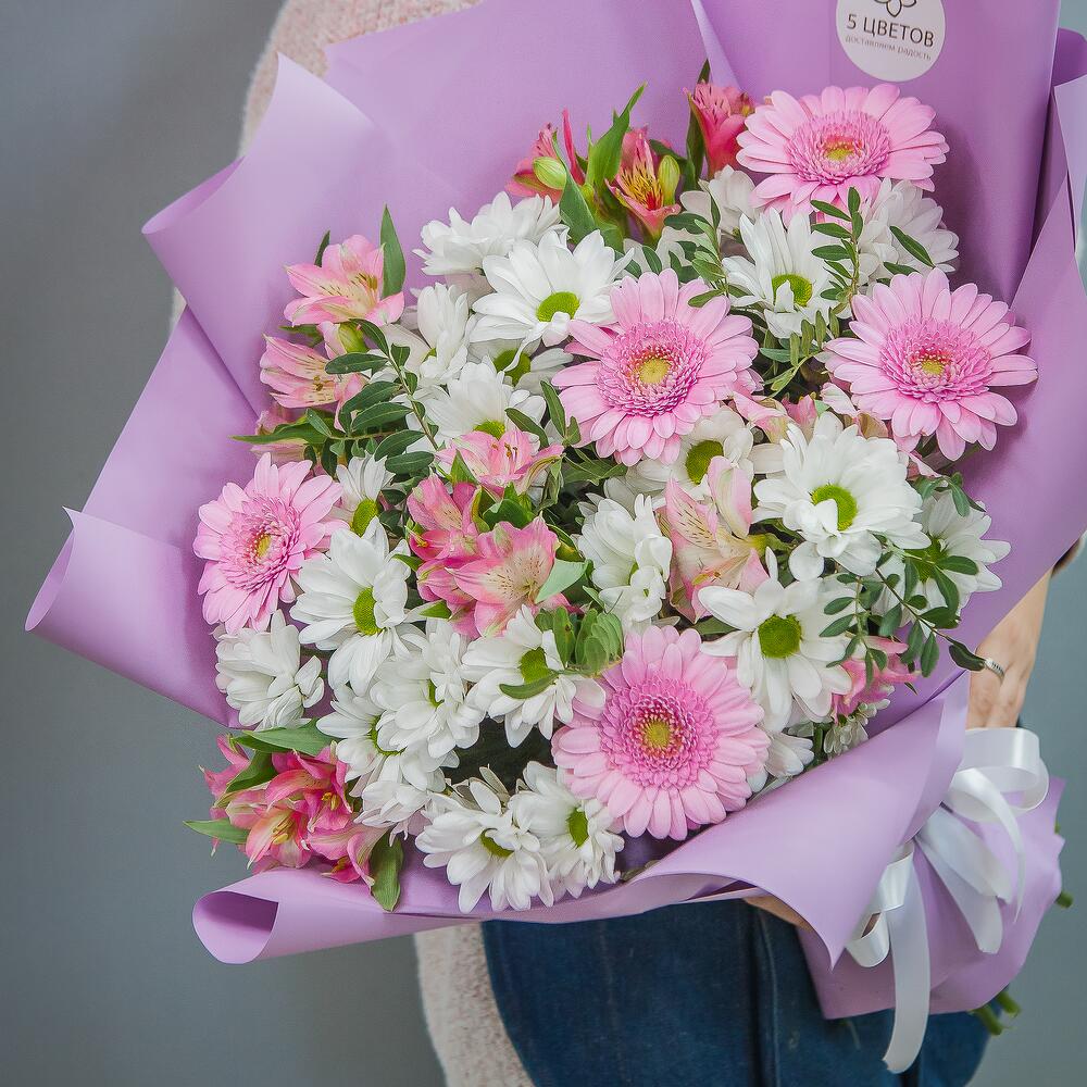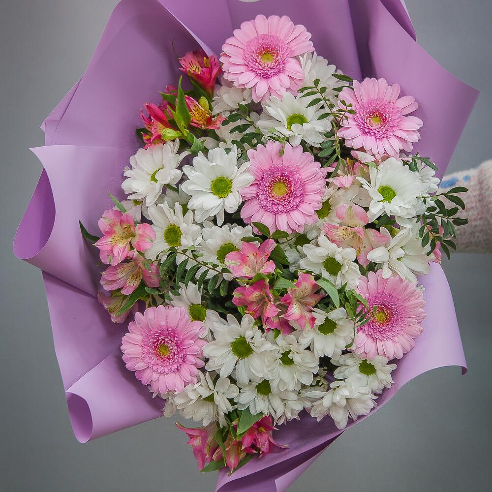 Хризантема – 5 шт.Альстромерия розовая – 7 шт.Гербера розовая – 5 шт.Фисташка – 3 шт.