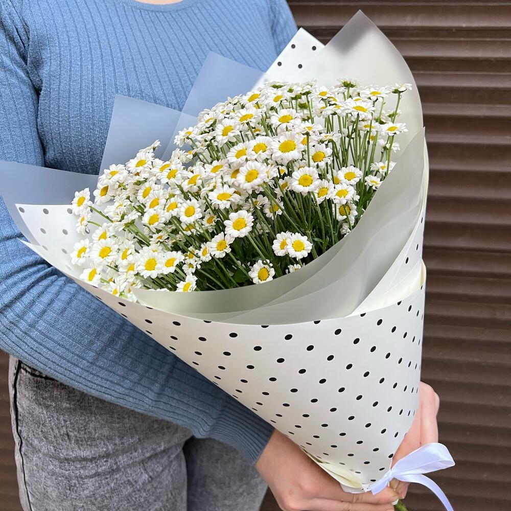 Лента атласная – 2 шт.Пленка матовая – 1 шт.Хризантема сантини ромашка – 7 шт.Дизайнерская упаковка – 1 шт.