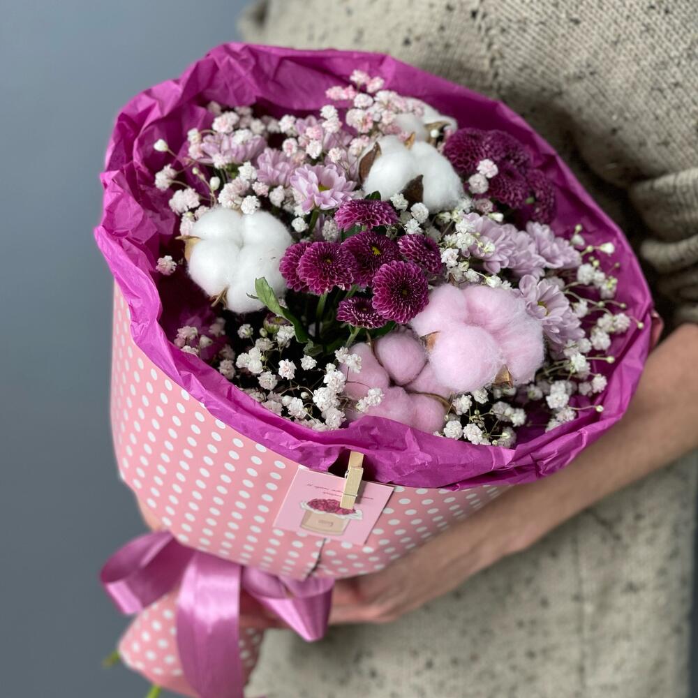 Гипсофила – 2 шт.Хлопок – 5 шт.Хризантема Сантини – 4 шт.Лента атласная – 1 шт.Упаковка дизайнерская – 1 шт.Открыточка с вашими пожеланиями – 1 шт.