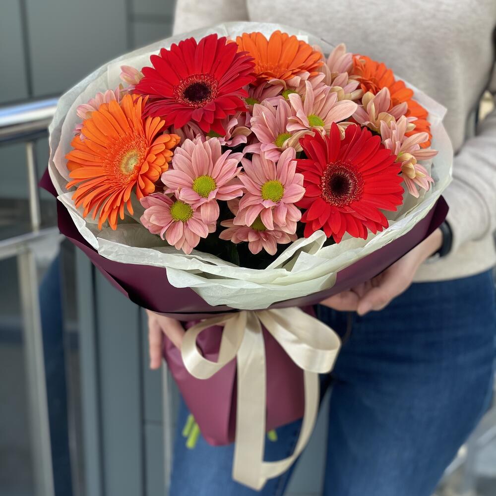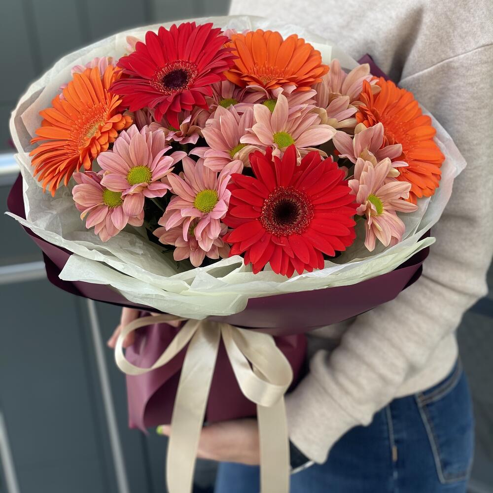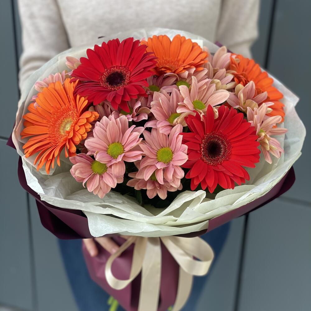 Хризантема – 4 шт. Гербера – 5 шт. Оформление – 1 шт.