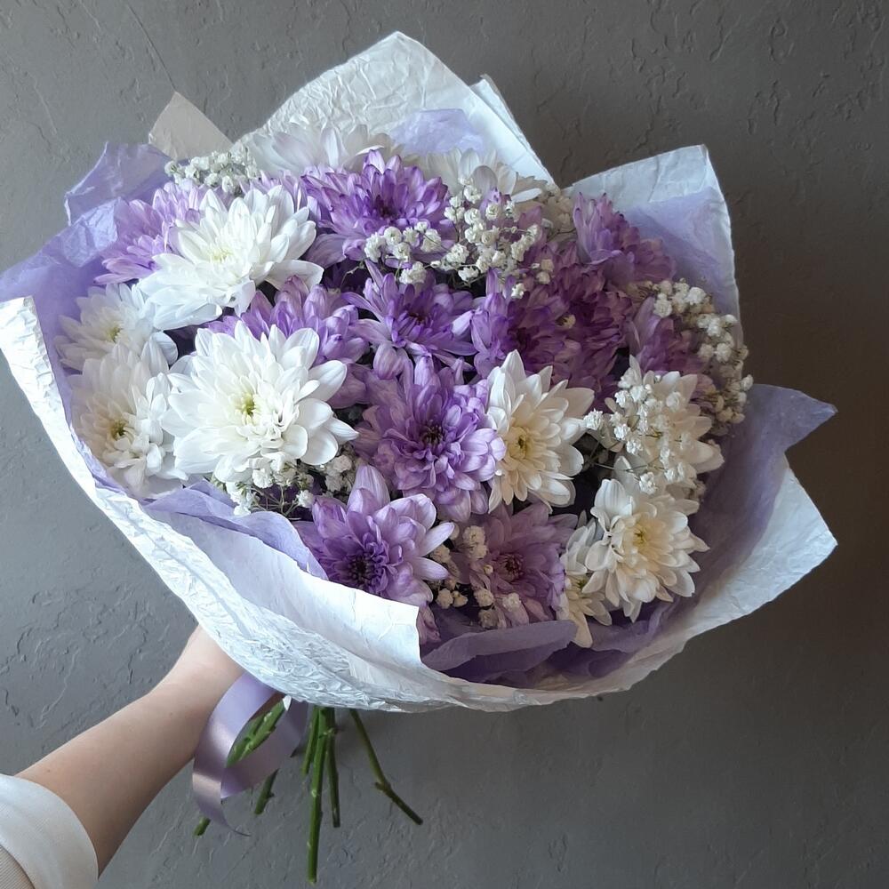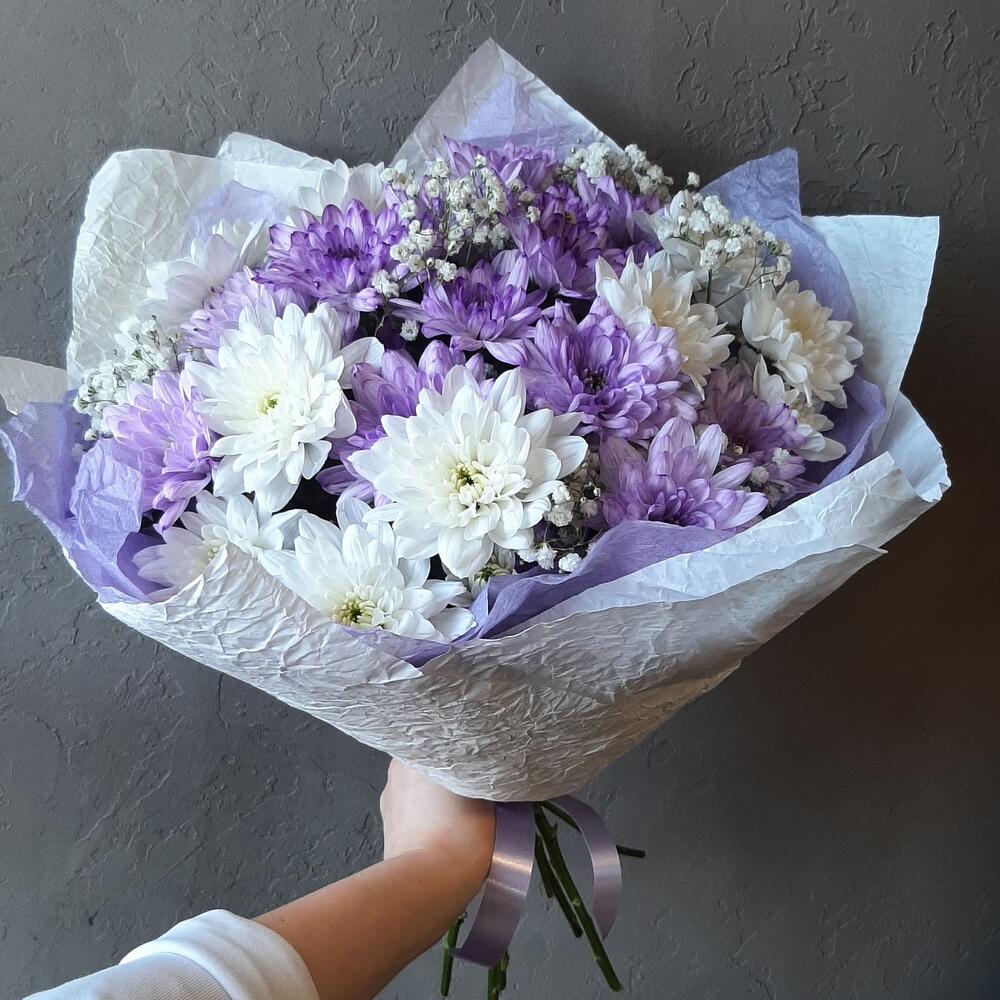 Хризантема кустовая белая – 3 шт.Хризантема кустовая крашенная – 4 шт.Гипсофила – 3 шт.Упаковка дизайнерская – 1 шт.