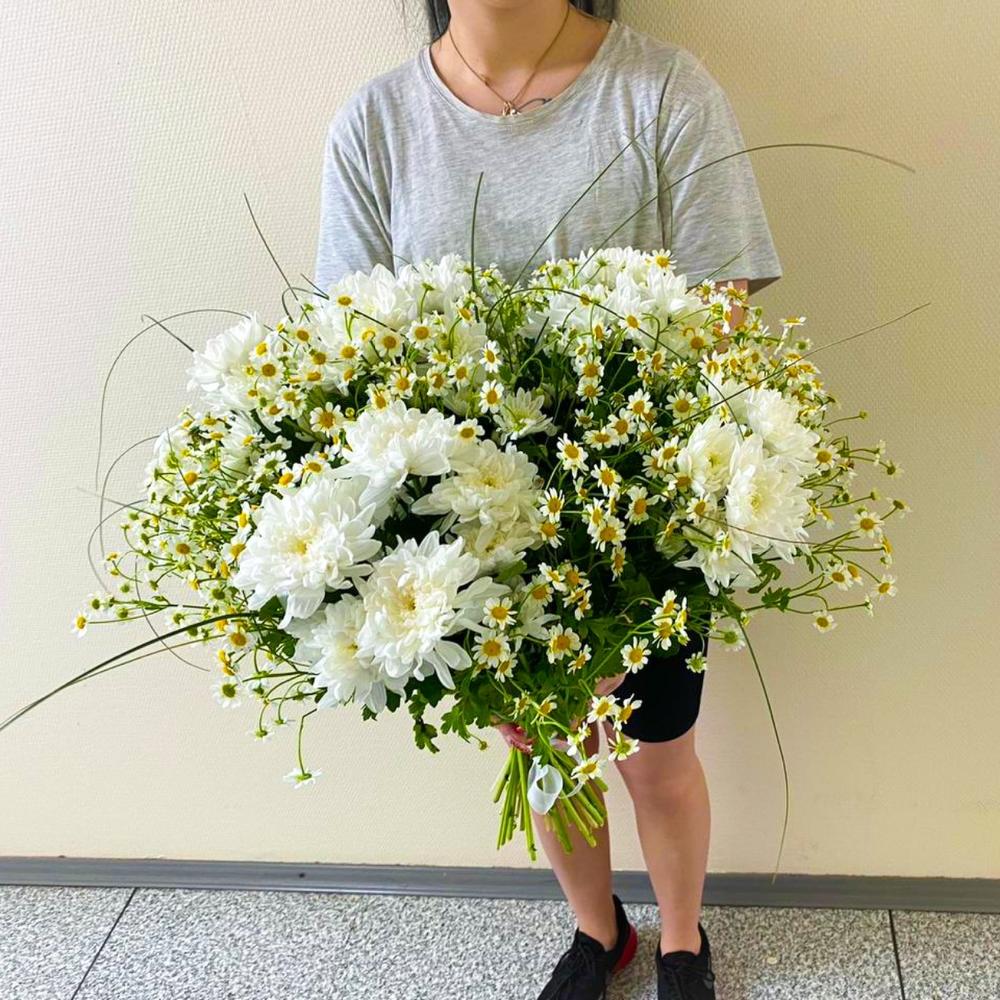 Матрикария – 25 шт.Хризантема кустовая – 5 шт.Лента атласная – 2 шт.