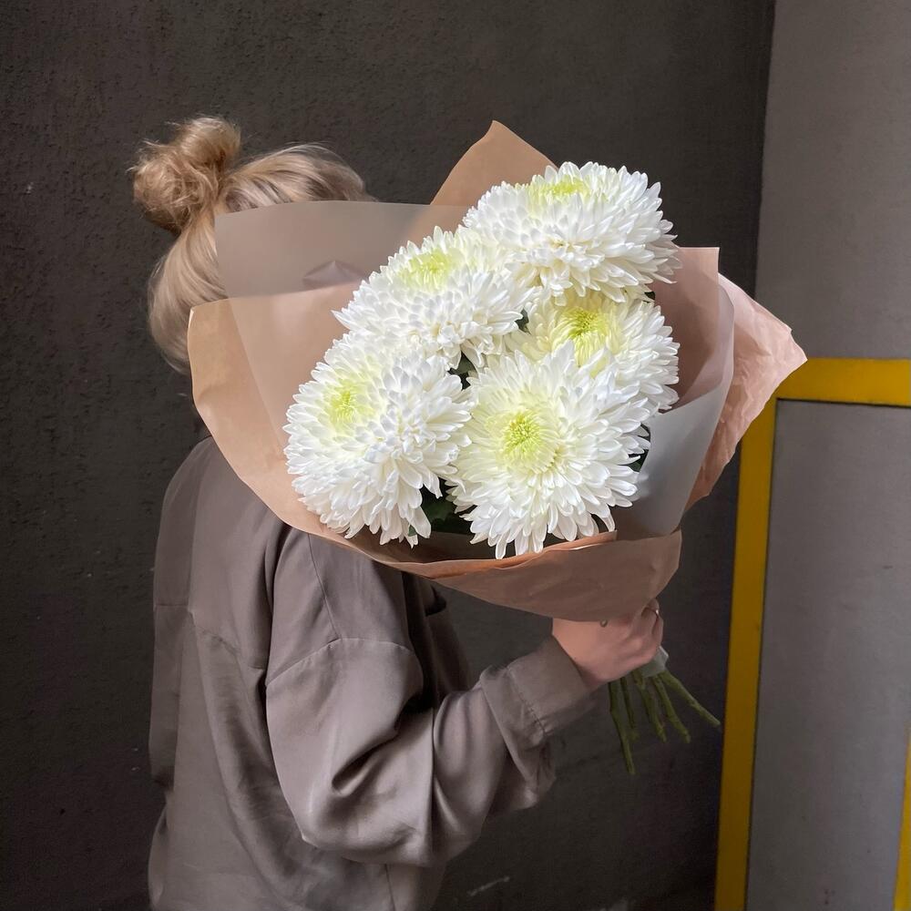 Белоснежный букет из стойких хризантем в стильной упаковке для тех, кто ЗА: стойкость и ПРОТИВ: сборных букетов.