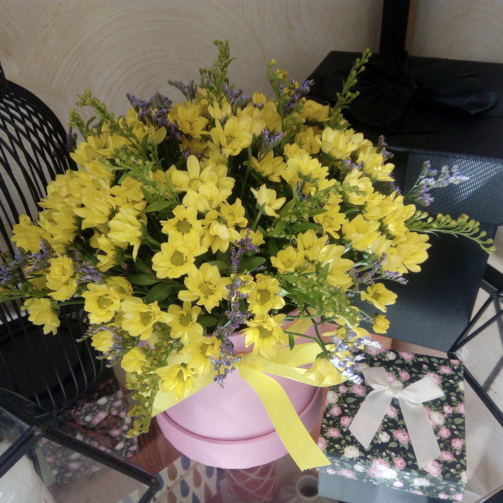 Хризантема кустовая – 15 шт.Лаванда (сухоцвет) – 33 шт.Зелень – 9 шт.Коробка шляпная – 1 шт.Оазис флористический – 1 шт.Лента – 1 шт.