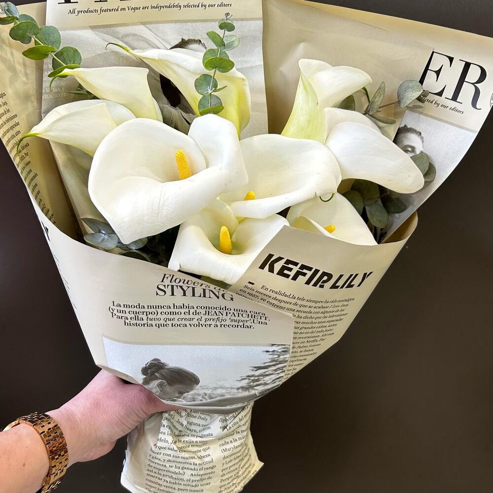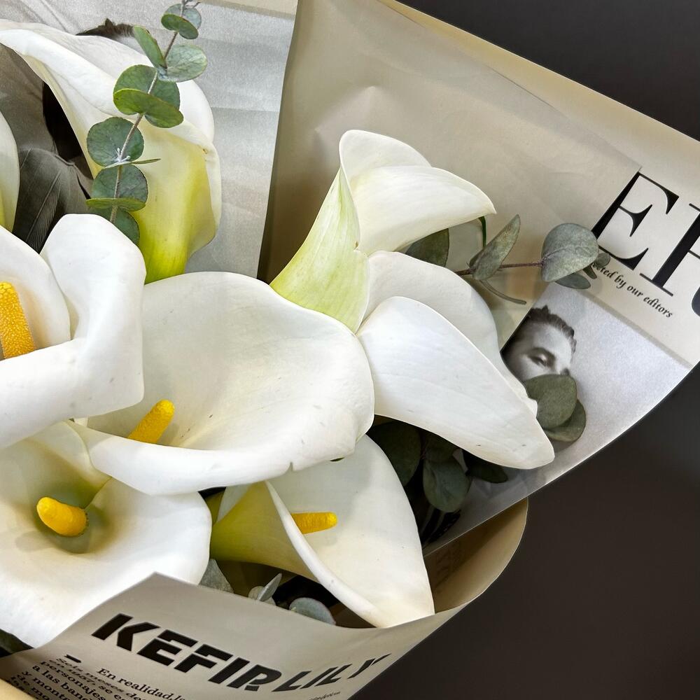 Букет из белой каллы и ароматного эвкалипта в упаковке