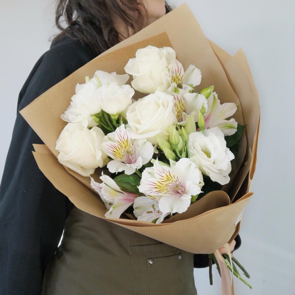 Роза Венделла – 3 шт.Альстромерия белая – 2 шт.лизиантус росита вайт – 2 шт.Упаковка крафт – 1 шт.Лента атласная – 1 шт.
