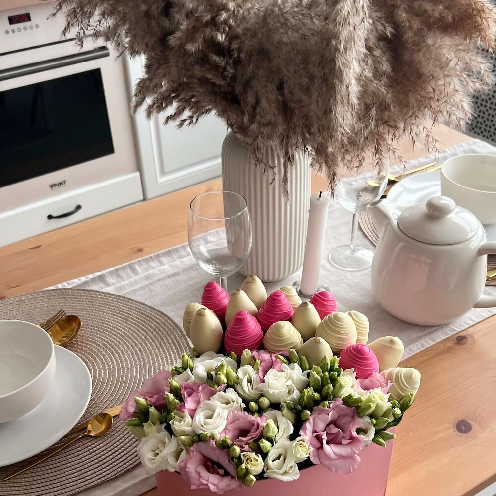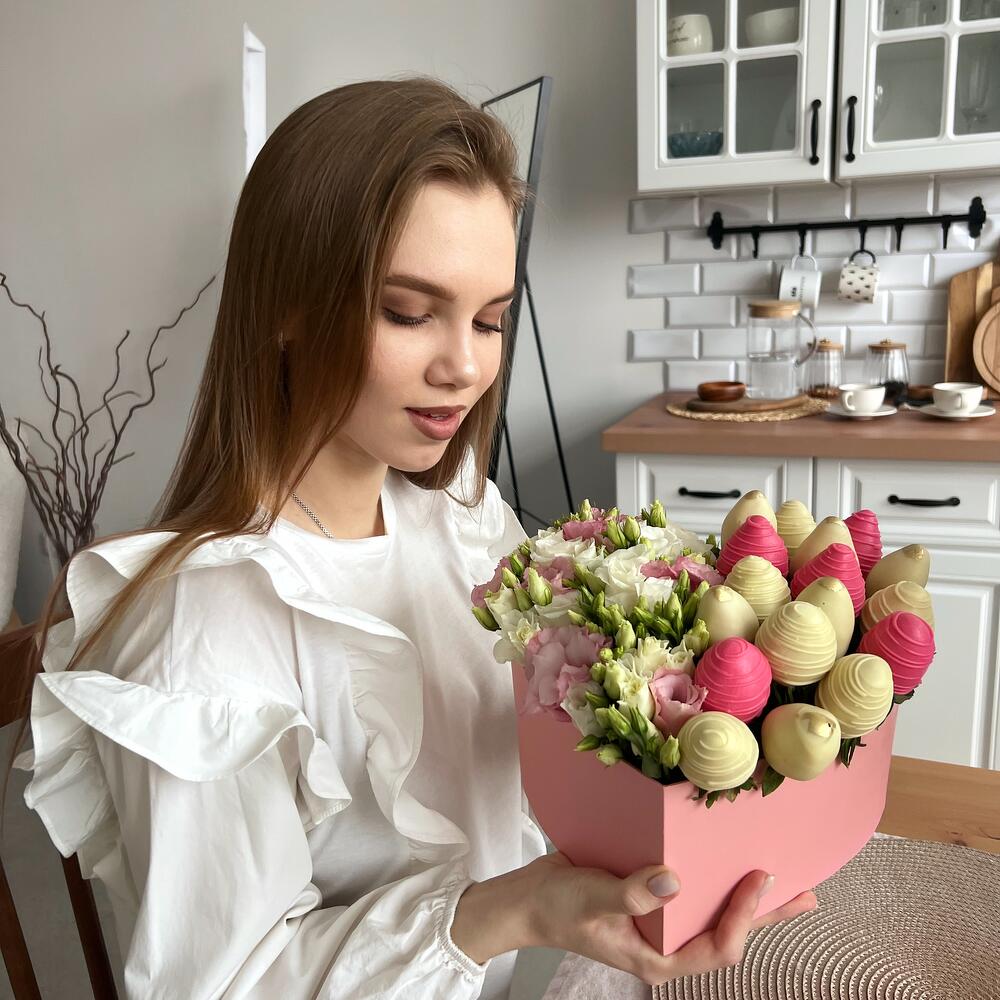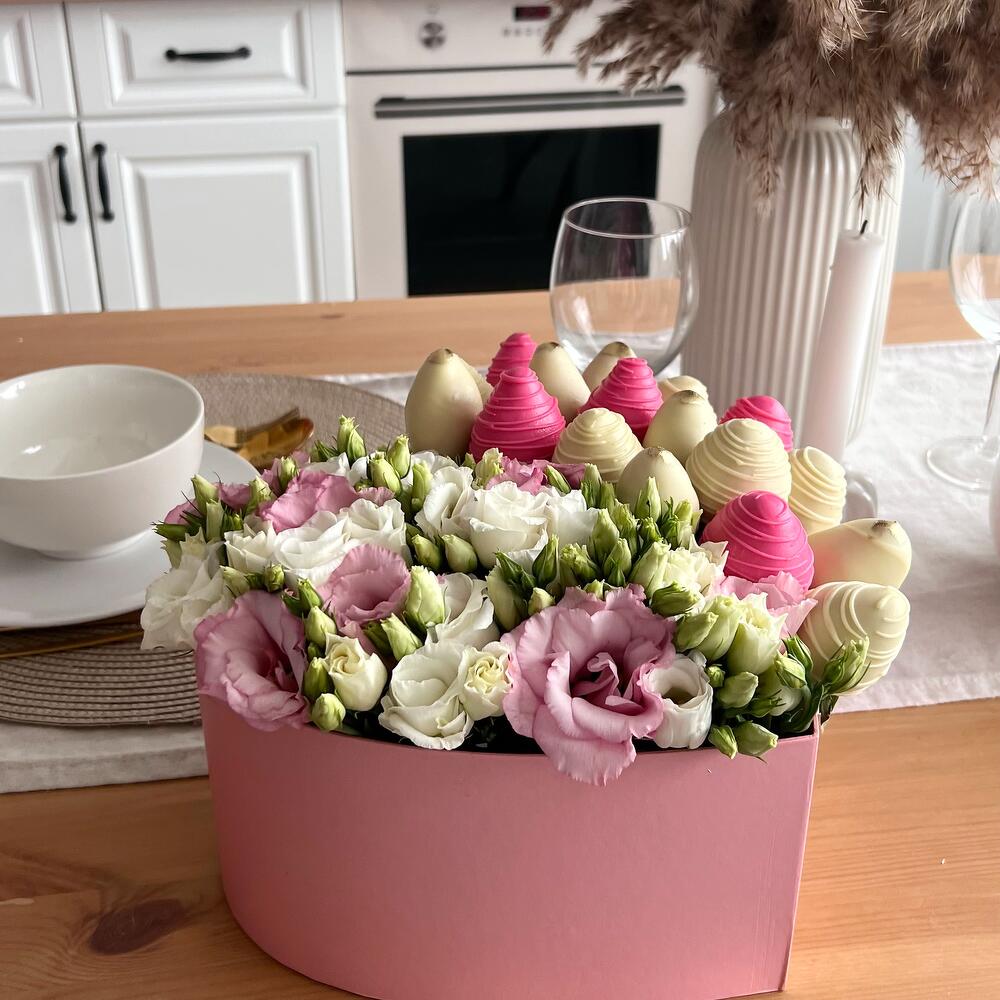 клубника в бельгийском шоколаде – 550 гр.эустома белая и розовая – 7 шт.бокс в форме сердца – 1 шт.