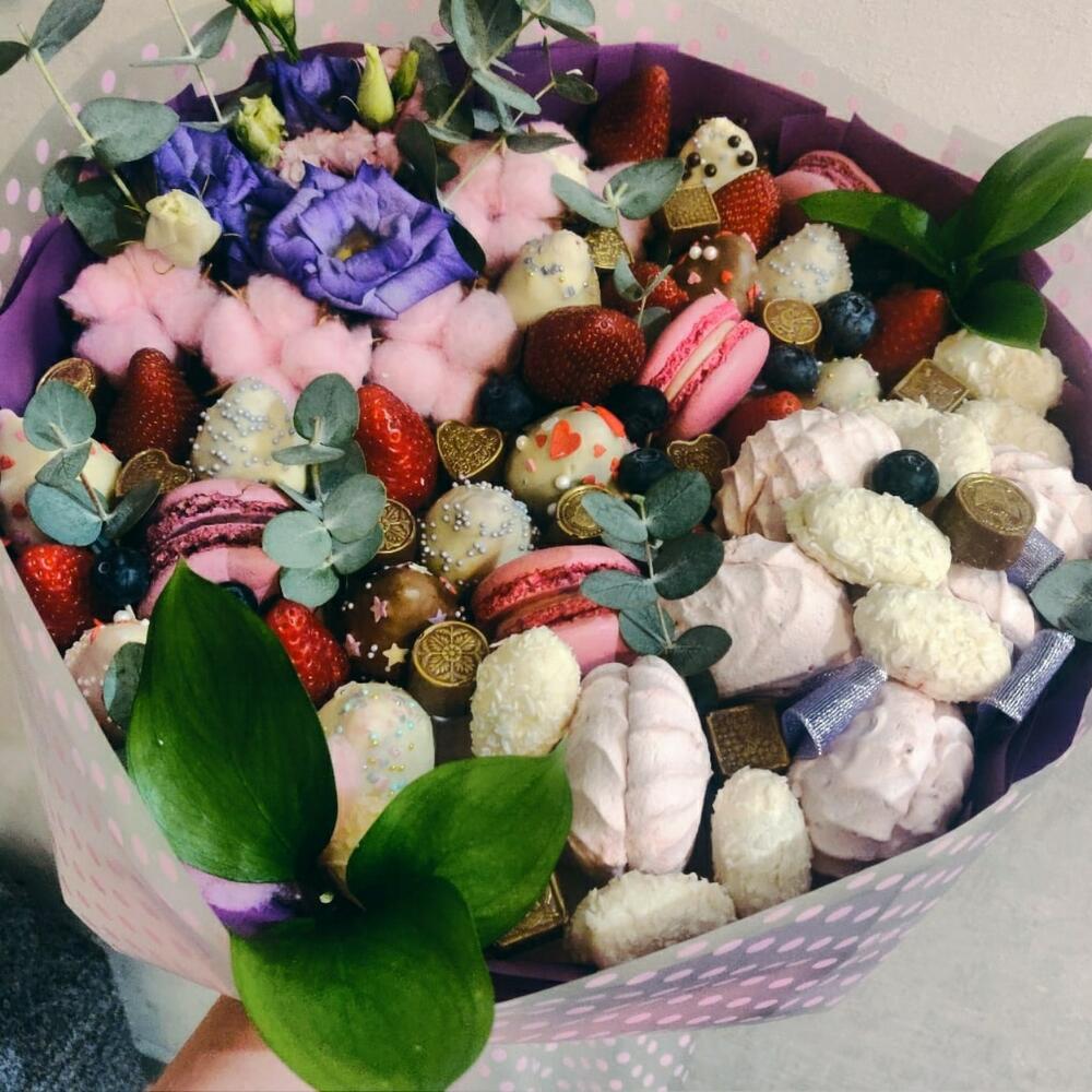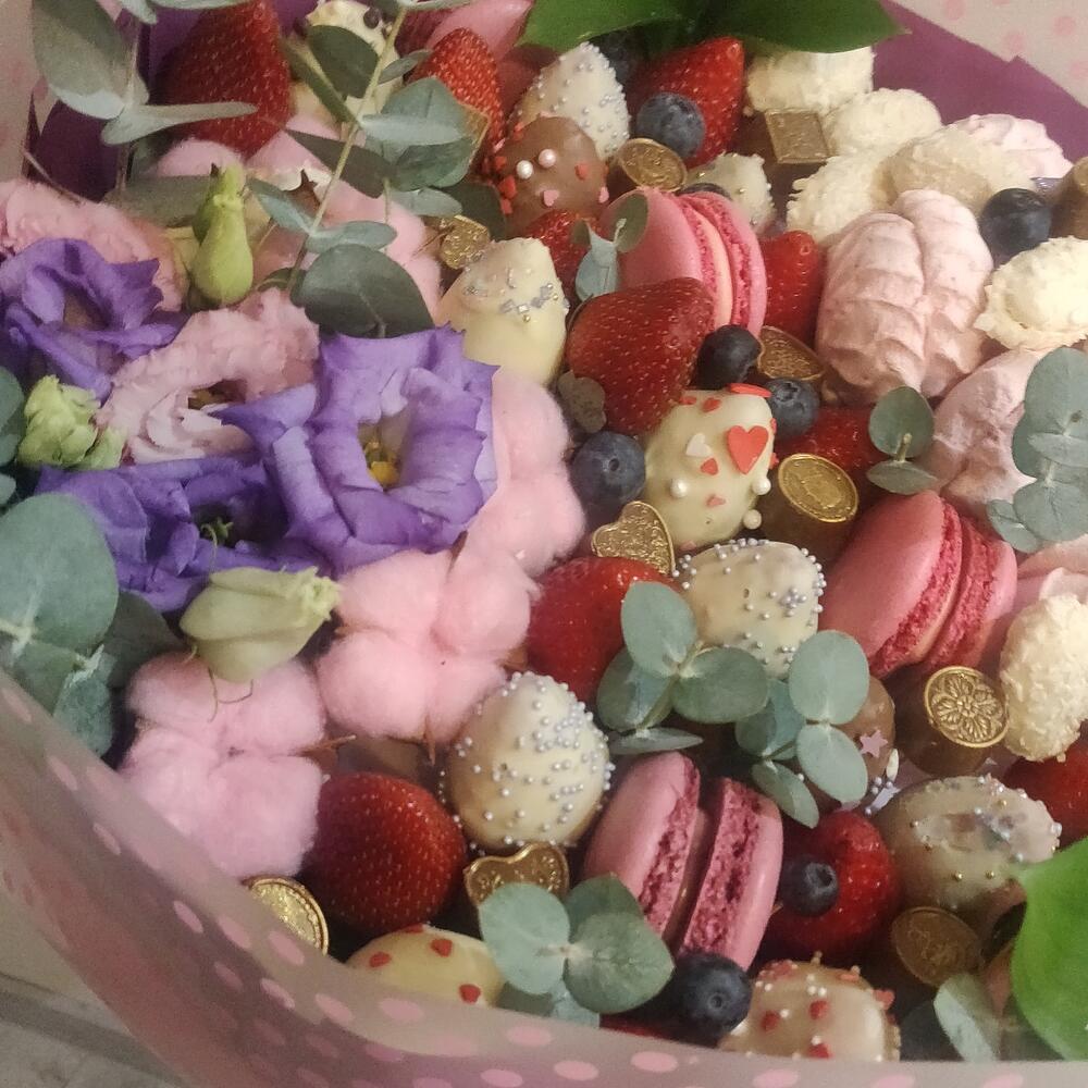 Клубника – 13 шт.Голубика – 10 шт.Лизиантус сиреневый – 4 шт.Хлопок натуральный – 7 шт.Лизиантус алиса пинк – 3 шт.макарон (пирожное) – 4 шт.Зефир клубничный – 6 шт.Клубника в шоколаде callebaut (бельгия) – 14 шт.зелень декоративная – 4 шт.конфеты кокосовые – 12 шт.транспортировочная упаковка – 1 шт.Упаковка дизайнерская – 1 шт.конфеты золотые – 16 шт.
