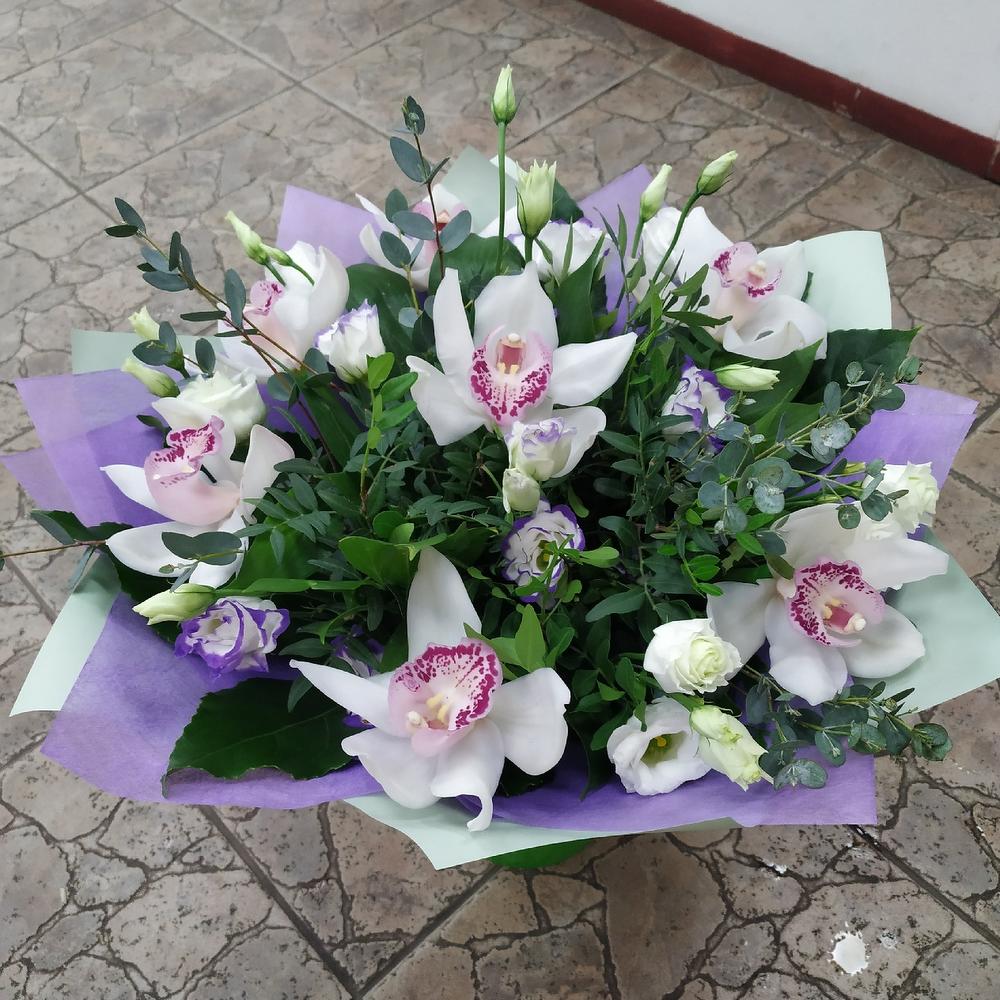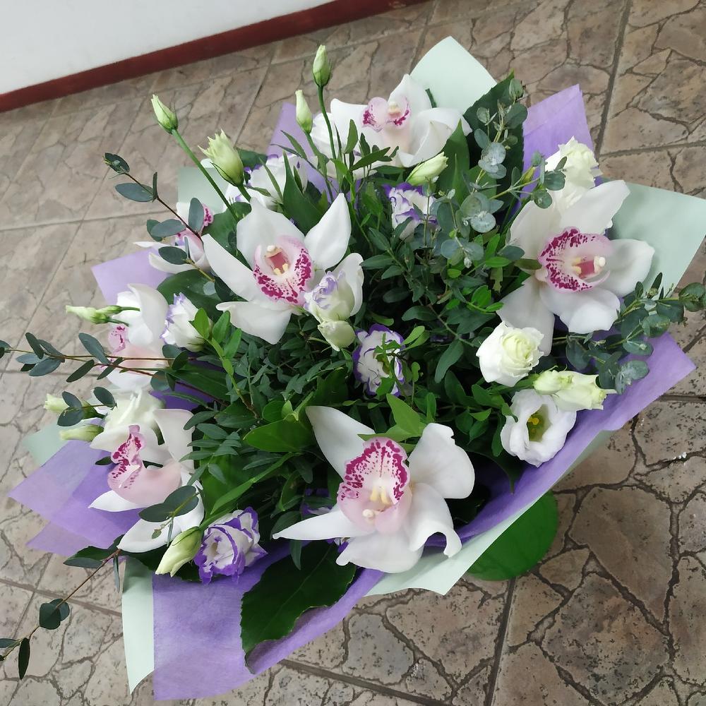 Орхидея Цимбидиум – 7 шт.Лизиантус – 5 шт.Эвкалипт – 3 шт.Фисташка – 3 шт.Упаковка дизайнерская – 1 шт.
