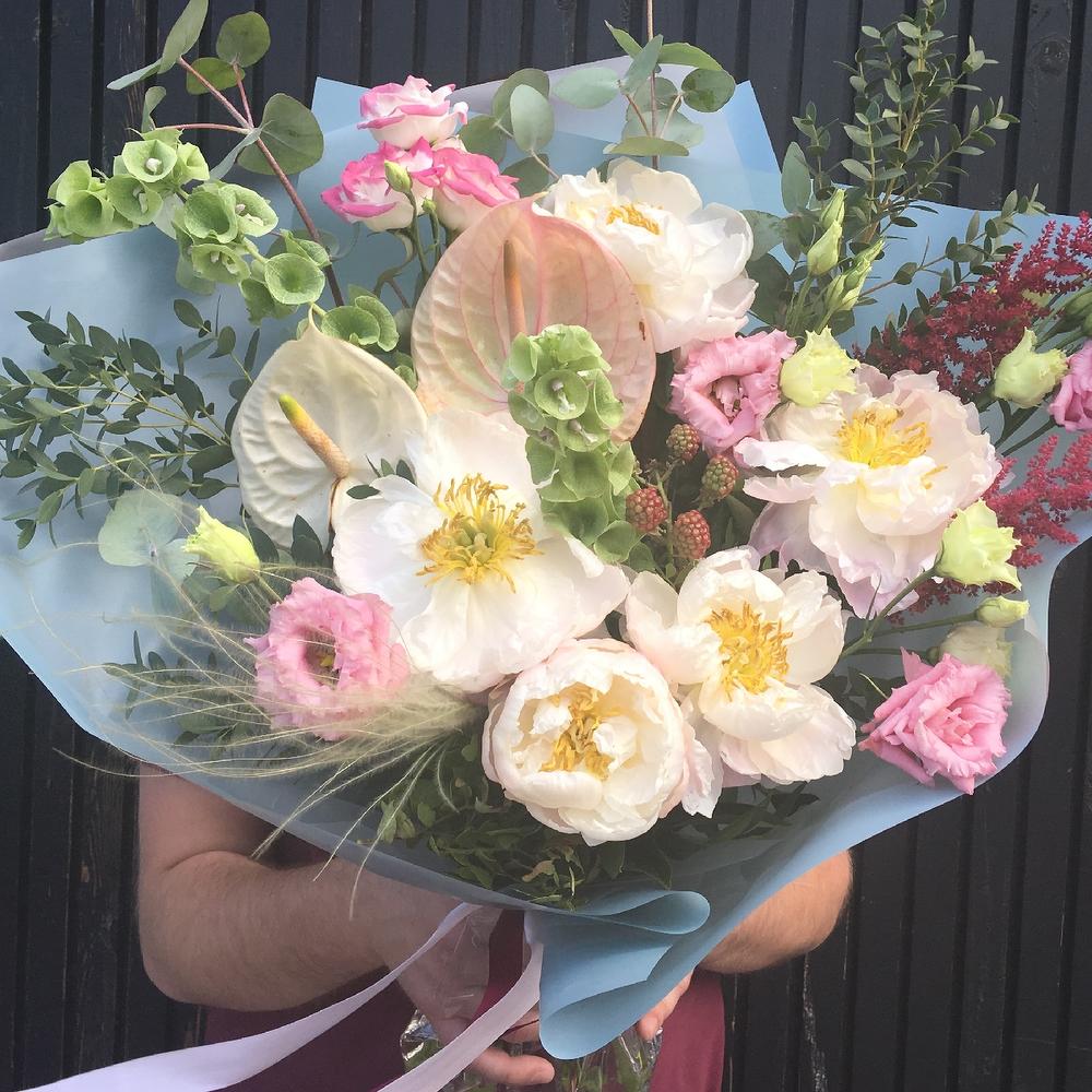 Антуриум – 2 шт.Пион – 5 шт.Лизиантус – 5 шт.Астильба – 2 шт.Молюцелла – 2 шт.Ковыль – 1 шт.Ежевика – 1 шт.Эвкалипт – 7 шт.Упаковка – 2 шт.Лента атласная – 2 шт.