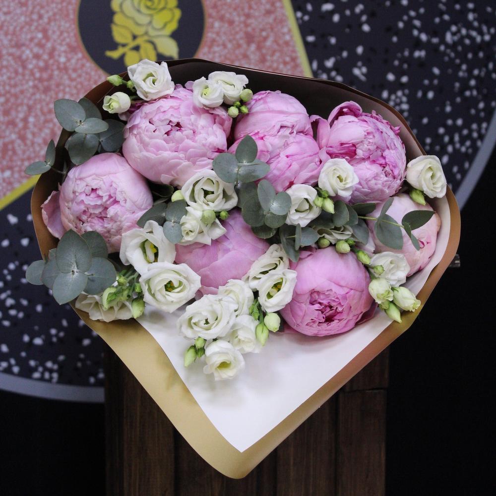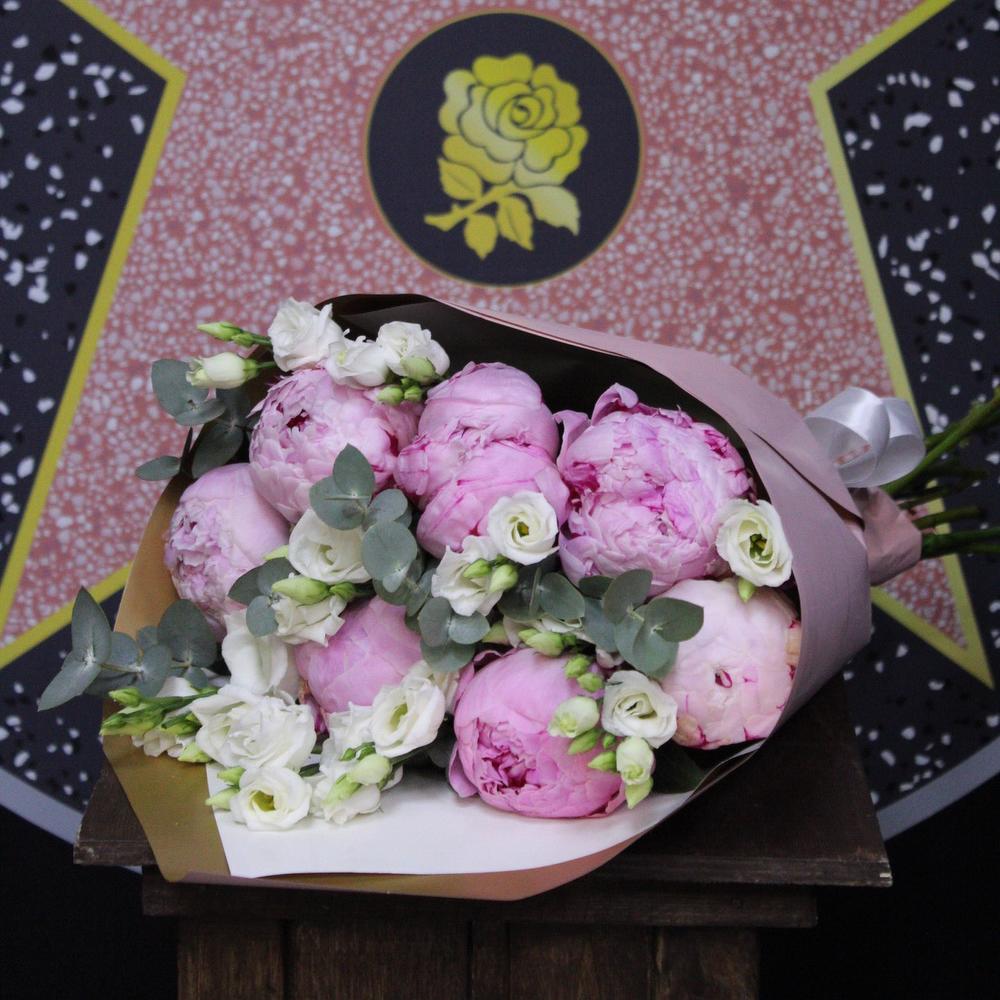 Лента атласная – 2 шт.Пион Сара Бернар – 7 шт.Пленка матовая – 2 шт.эустома белая – 3 шт.Эвкалипт Baby Blue – 3 шт.