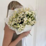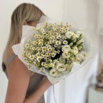 Матрикария – 3 шт.Сантини – 3 шт.Эустома – 3 шт.Дизайнерская упаковка – 3 шт.